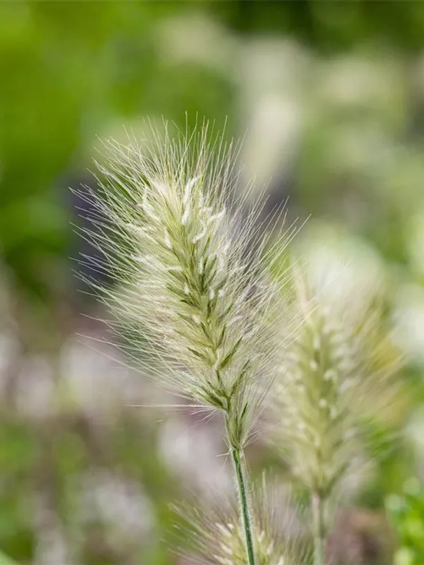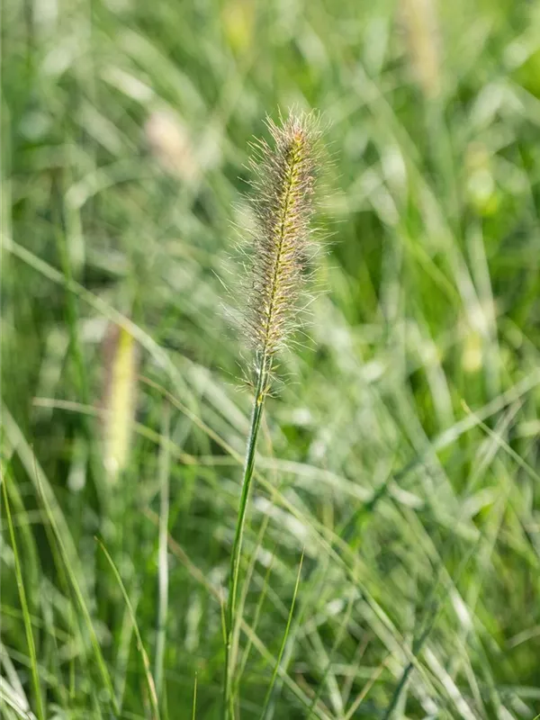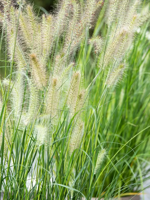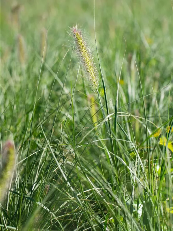 Das Garten-Federborstengras 'Little Bunny' (Pennisetum alopecuroides) ist mit seiner mittelgrünen Blattfärbung ein dekoratives Gestaltungselement im Garten, welches sich an einem sonnigen Standort mit einem möglichst durchlässigen, nährstoffreichen Boden am wohlsten fühlt. Die bernsteingelben Blütenwedel schmücken die buschig wachsende Pflanze ab Sommer. Bei günstigen Bedingungen erreicht dieses winterharte Gras eine Höhe von ca. 30 cm und wird bis zu 30 cm breit.