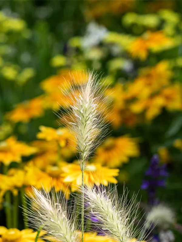 Die bernsteingelben Blüten des Garten-Federborstengras 'Little Bunny' erscheinen in Rispen von Juli bis September.