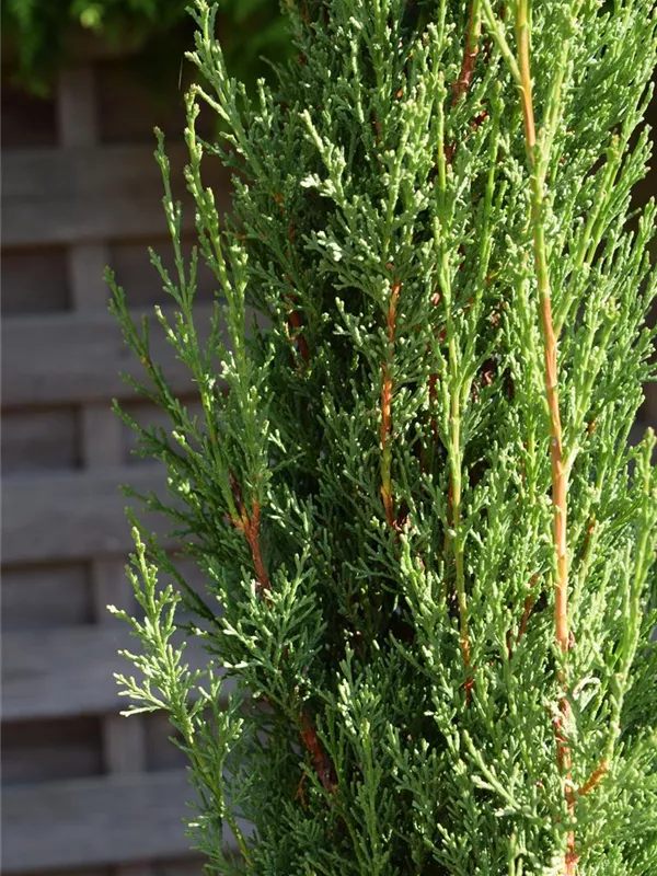 Die Echte Säulenzypresse 'Stricta' ist immergrün. Ihre Nadeln sind dunkelgrün, schuppenförmig.