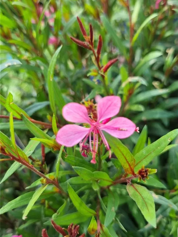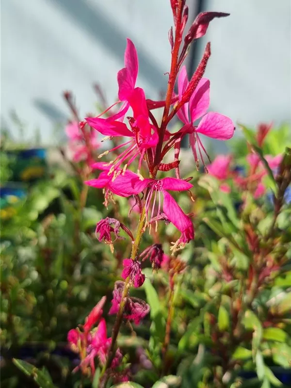 Gaura lindheimeri 'Geyser Pink' bildet in Rispen angeordnete, pinke Blüten ab Juni.
