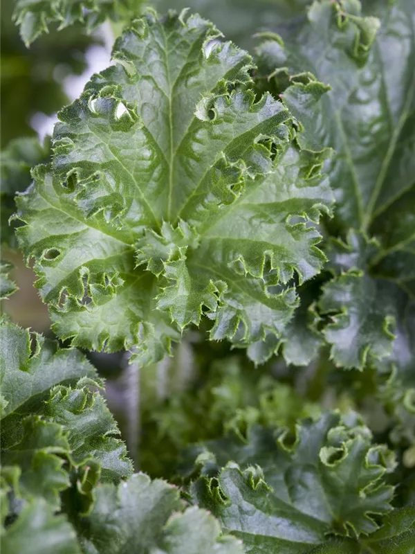 Hoher Blattschmuckwert. Die wintergrünen Blätter des Purpurglöckchens 'Apple Crisp' sind hellgrün, herzförmig, gebuchtet.