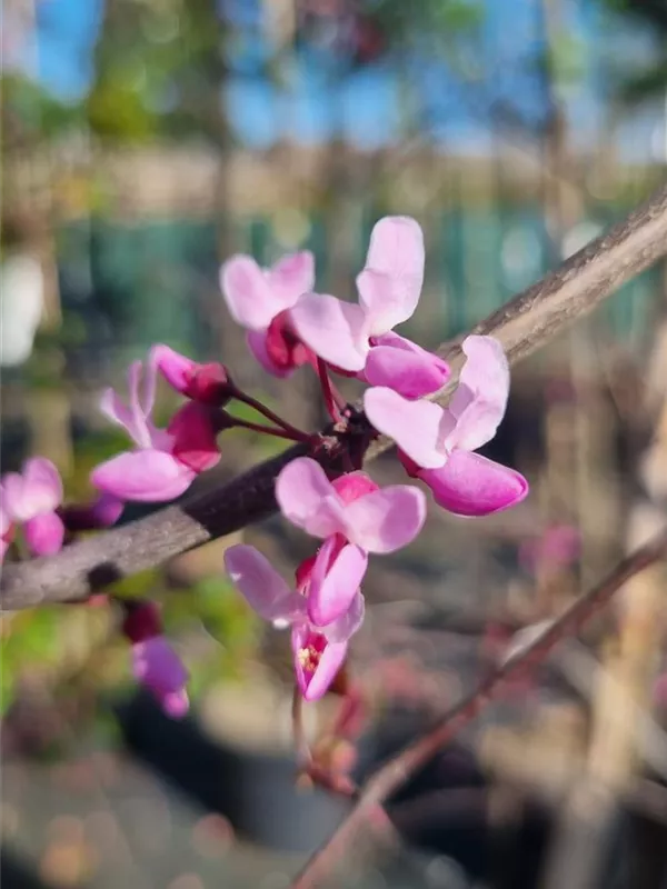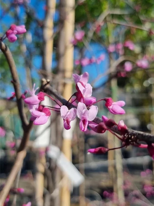 Der Judasbaum 'Forest Pansy' (Cercis canadensis) ist ein ausladender, malerischer, breiter, lockerer Großstrauch oder Kleinbaum, der pinke, schmetterlingsförmige, in Trauben angeordnete Blüten hervorbringt. Sie erscheinen von April bis Mai. Besonders dekorativ ist der leuchtend rote Jungaustrieb. An einem sonnigen, windgeschützten Standort mit durchlässigem, kalkhaltigem, nährstoffreichem Boden erreicht er gewöhnlich eine Höhe von ca. 4 m und wird ca. 4 m breit.