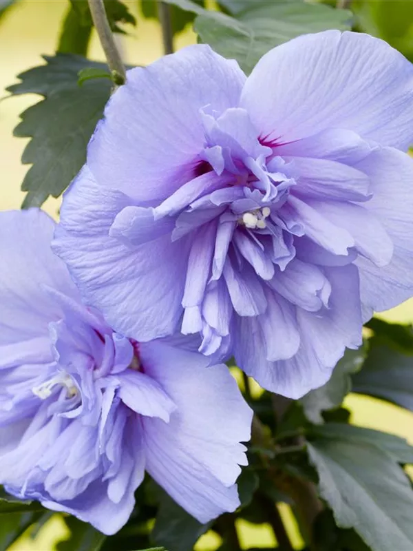 Die sommergrünen Blätter des Garteneibischs 'Blue Chiffon'® sind mittelgrün, eiförmig, wechselständig, gelappt.