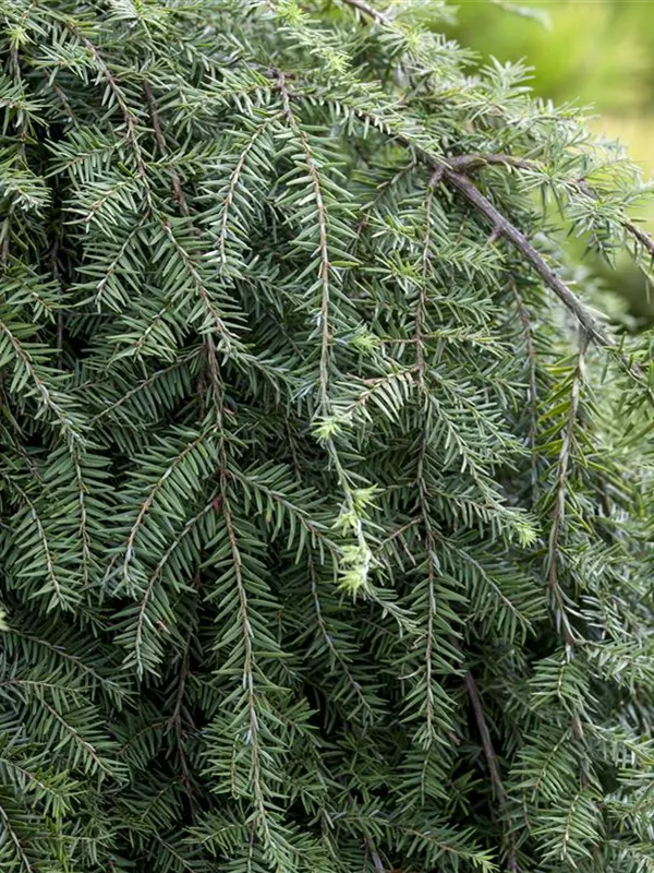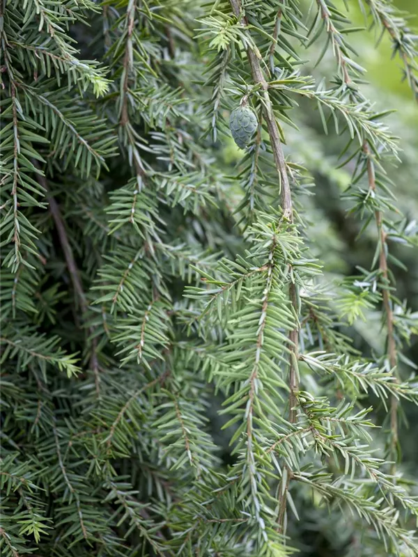 Die ovalen, braunen Zapfen von Tsuga canadensis 'Pendula' erscheinen ab September. Die jungen Zapfen haben eine blau-grüne Färbung.