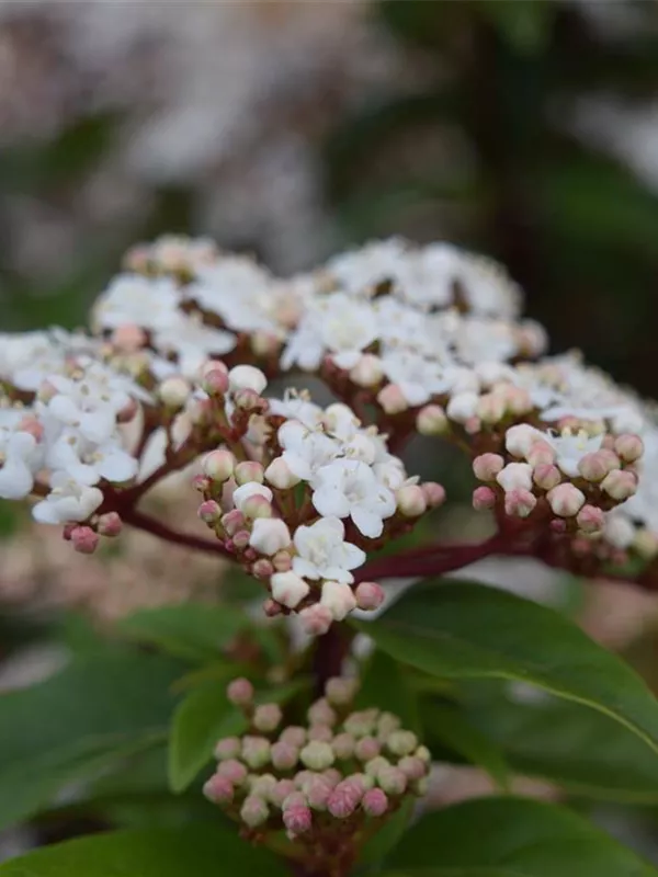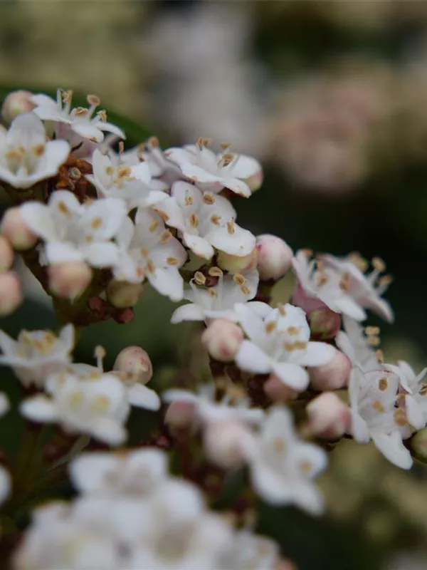 Die hellrosafarbenen Blüten des Lorbeer-Schneeball 'Eve Price' erscheinen in Schirmtrauben von Februar bis April. Diese sind leicht duftend. Bei richtiger Pflege Nachblüte im November.
