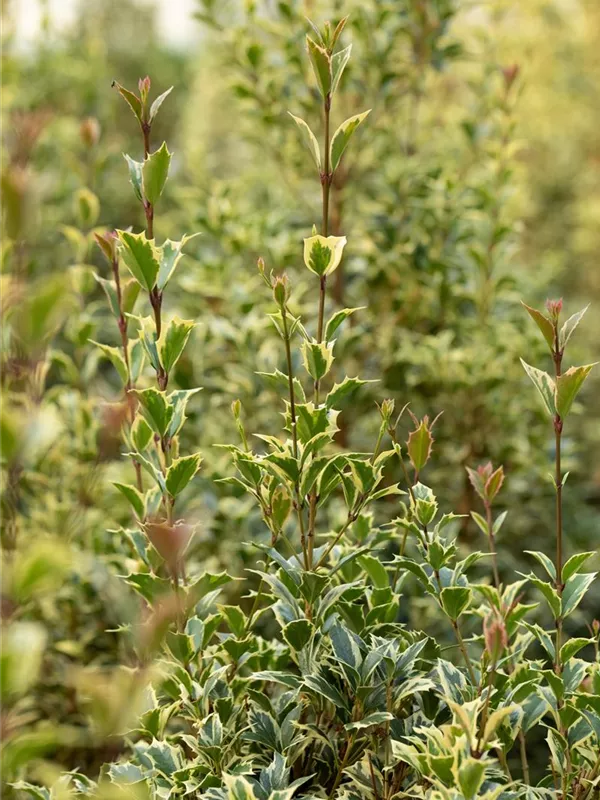Die Weißbunte Stechpalme 'Argentea Marginata' (Ilex aquifolium) ist ein ausladender, pyramidaler Großstrauch mit dekorativen, roten Früchten, die sehr lange haften. Die cremeweißen Blüten erscheinen von Mai bis Juni.