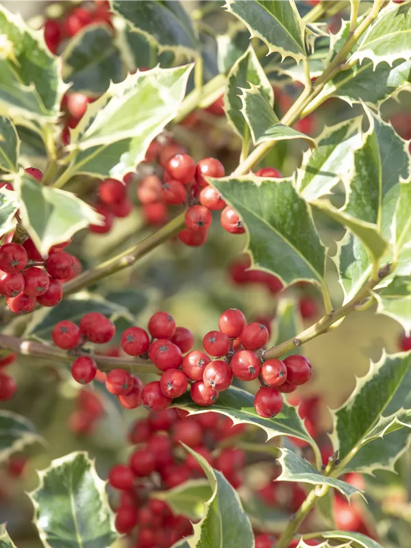 Besonders dekorativ sind die roten Steinfrüchte von Ilex aquifolium 'Argentea Marginata'. Diese erscheinen ab Oktober.Haften sehr lange.