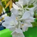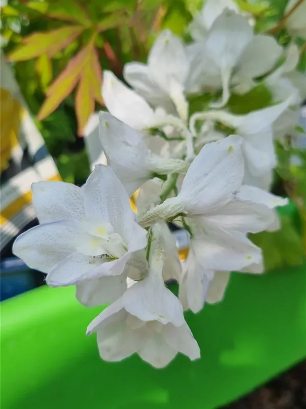 Delphinium pacific 'Galahad' bildet gefüllte, in Rispen angeordnete, weiße Blüten ab Juni. Bei richtiger Pflege Nachblüte von September bis Oktober.