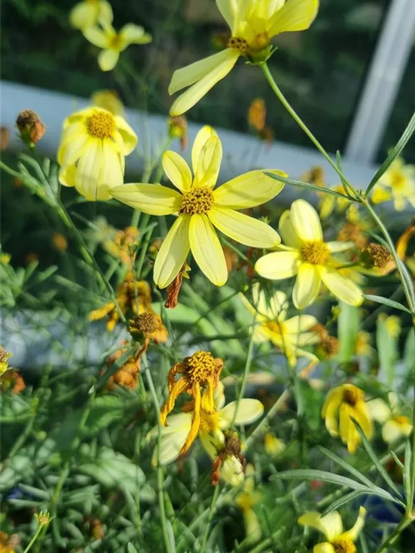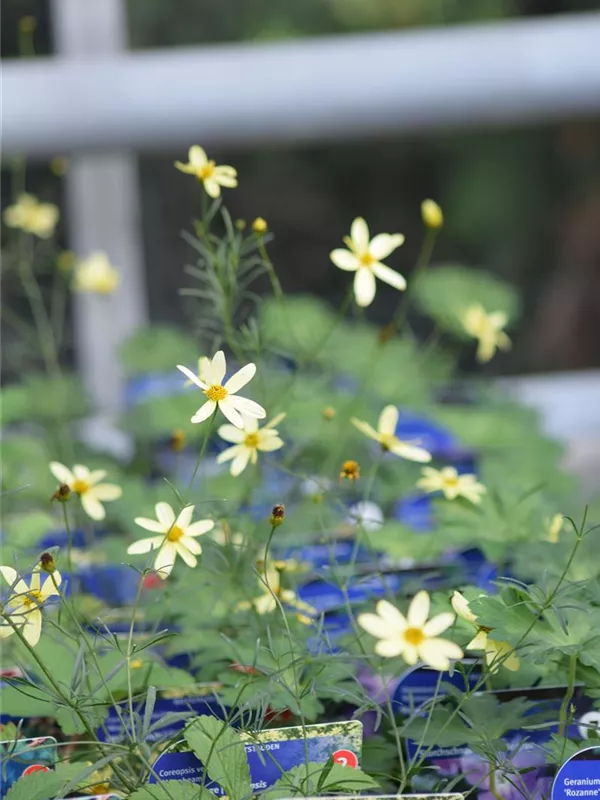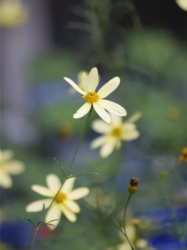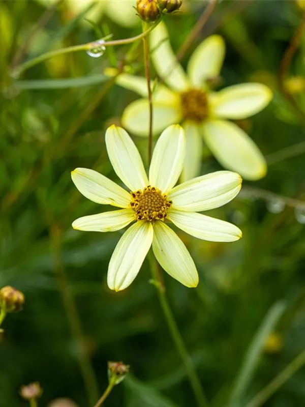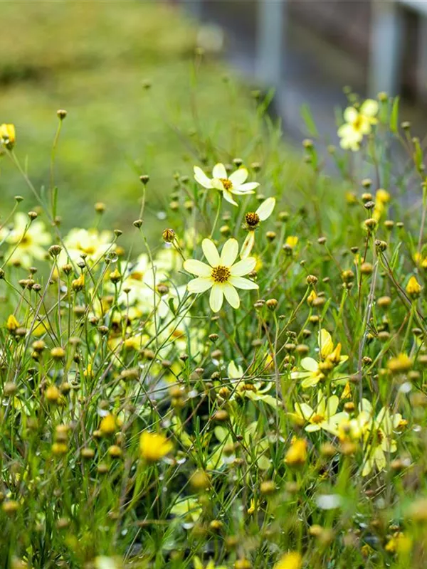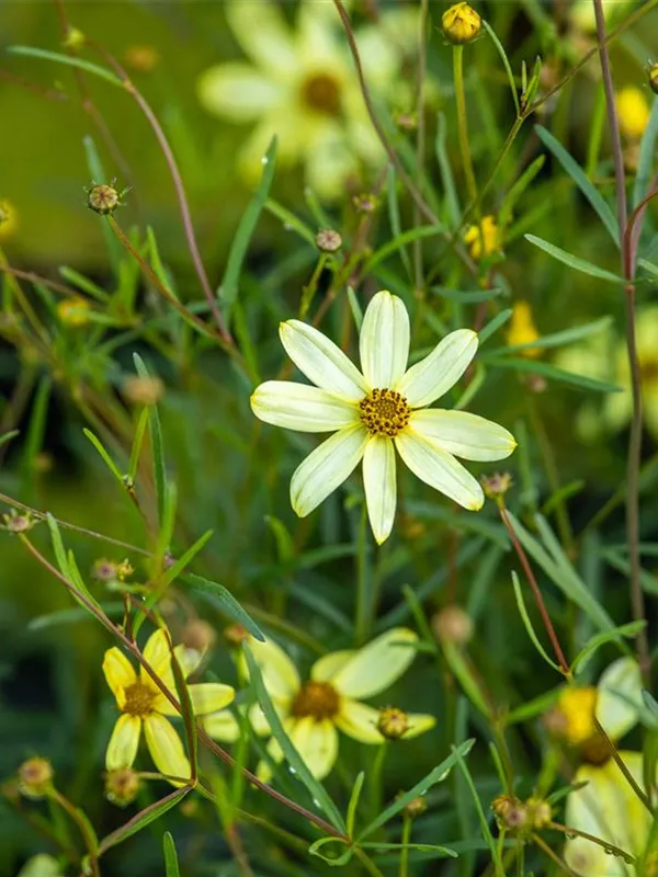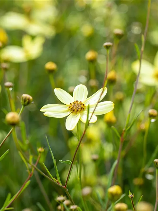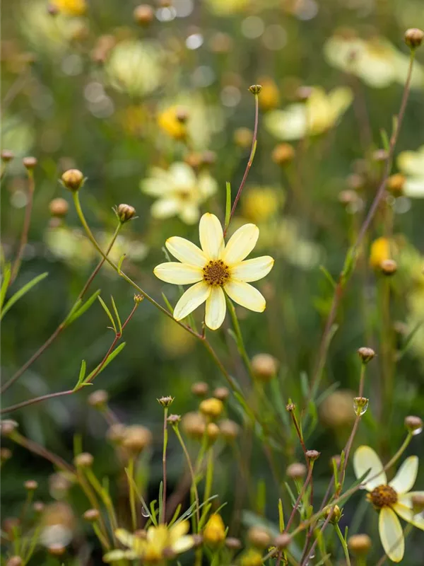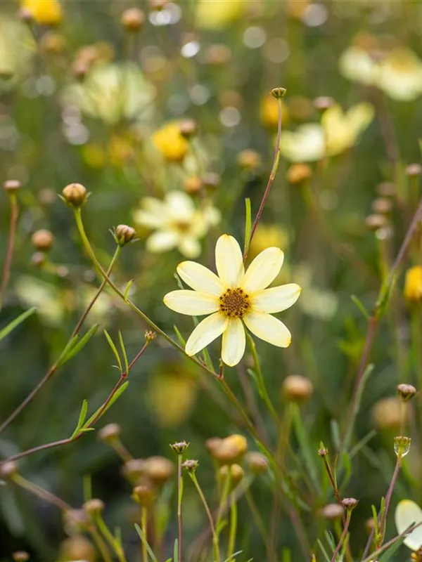 Coreopsis verticillata 'Moonbeam' bildet strahlenförmige, zitronengelbe Blüten ab Juni.