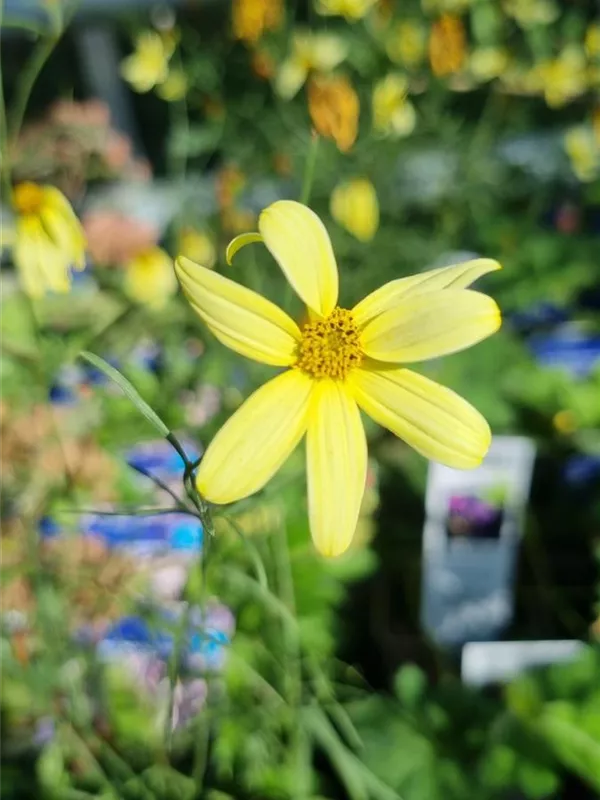 Das Mädchenauge 'Moonbeam' (Coreopsis verticillata) ist eine buschige, ausläuferbildende Staude, die von Juni bis September zitronengelbe, strahlenförmige Blüten bildet. An einem sonnigen Standort mit durchlässigem Boden erreicht es gewöhnlich eine Höhe von ca. 40 cm und wird ca. 30 cm breit. Das Mädchenauge 'Moonbeam' ist gut frostverträglich.