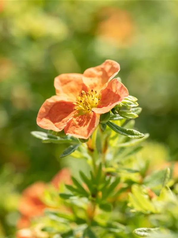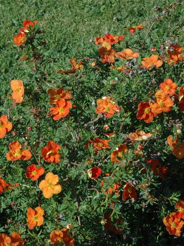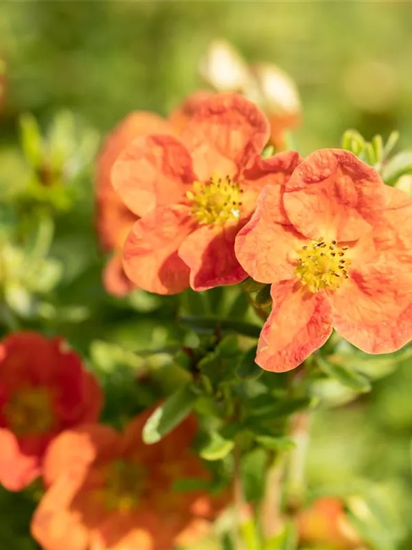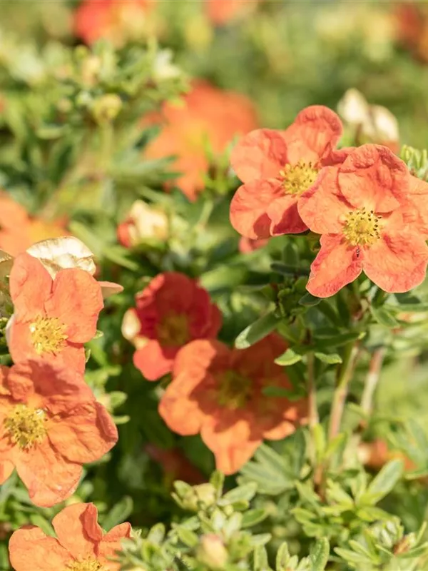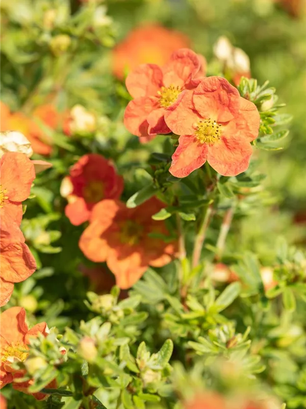 Der Fingerstrauch 'Red Ace' (Potentilla fruticosa) ist ein buschiger, breiter Zwergstrauch, der orange-rote, schalenförmige Blüten hervorbringt. Sie erscheinen von Juni bis Oktober. An einem sonnigen bis halbschattigen Standort mit durchlässigem Boden erreicht er gewöhnlich eine Höhe von ca. 60 cm und wird ca. 1,2 m breit.