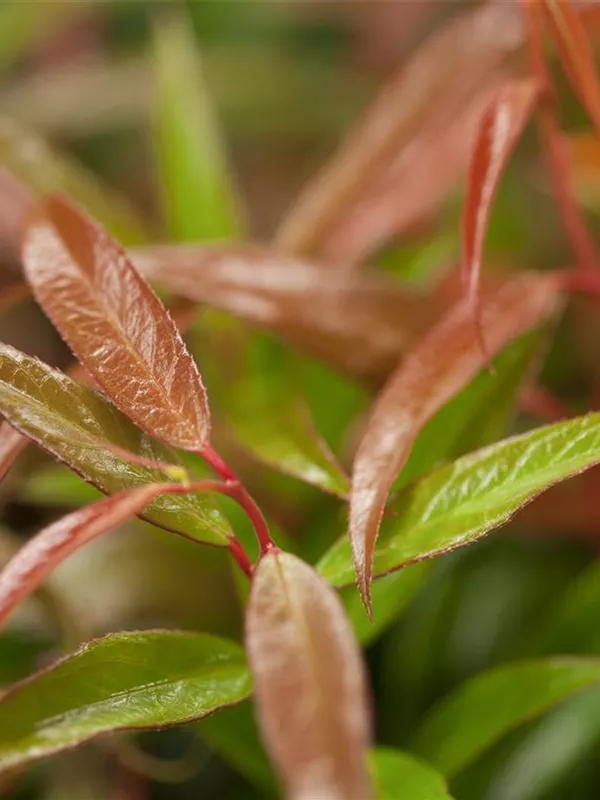 Die immergrünen Blätter der Traubenmyrthe 'Burning Love' sind glänzend, dunkelgrün, lanzettlich, gezähnt. Roter Austrieb. Mit seinem karminroten Laub setzt sie schöne Akzente im Winter.