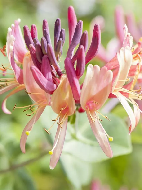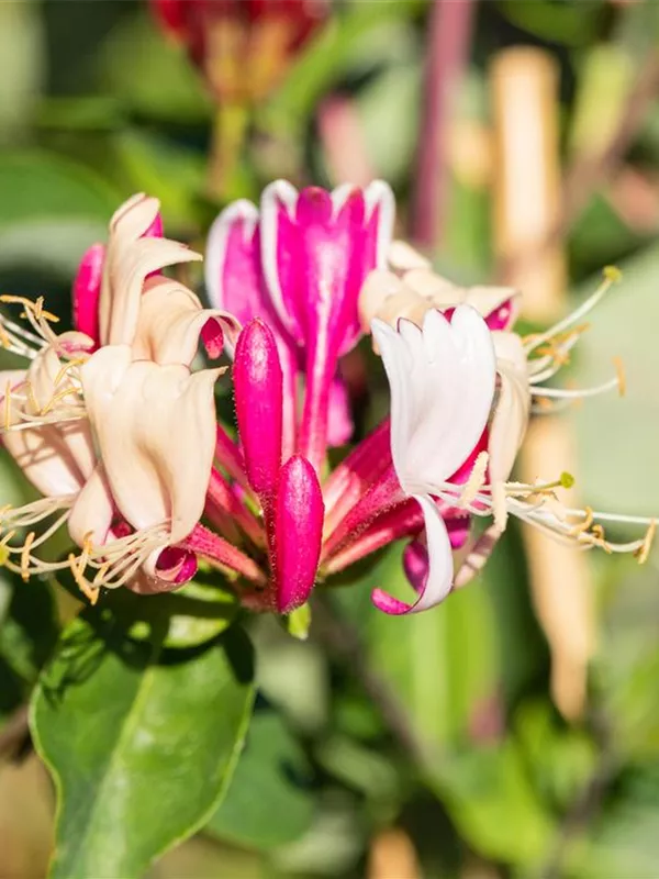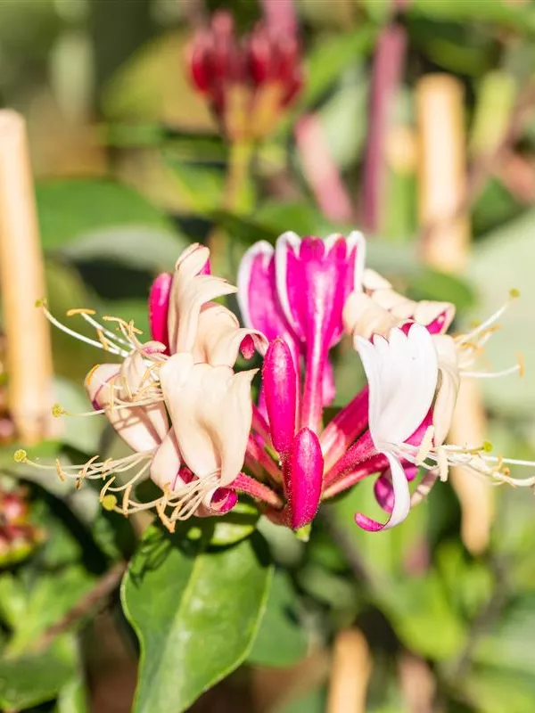Die Wald-Geißschlinge (Lonicera periclymenum) ist eine rankende Gartenpflanze mit dekorativen, dunkelroten, runden Früchten. Die röhrenförmigen Blüten erscheinen je nach Sorte in verschiedenen Farben.