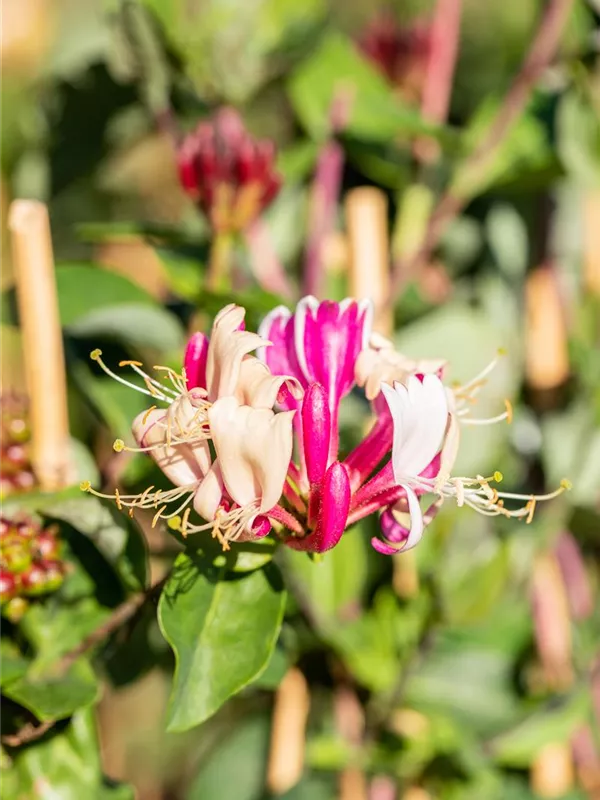 Besonders dekorativ sind die dunkelroten, runden Früchte von Lonicera periclymenum. Diese erscheinen ab August.