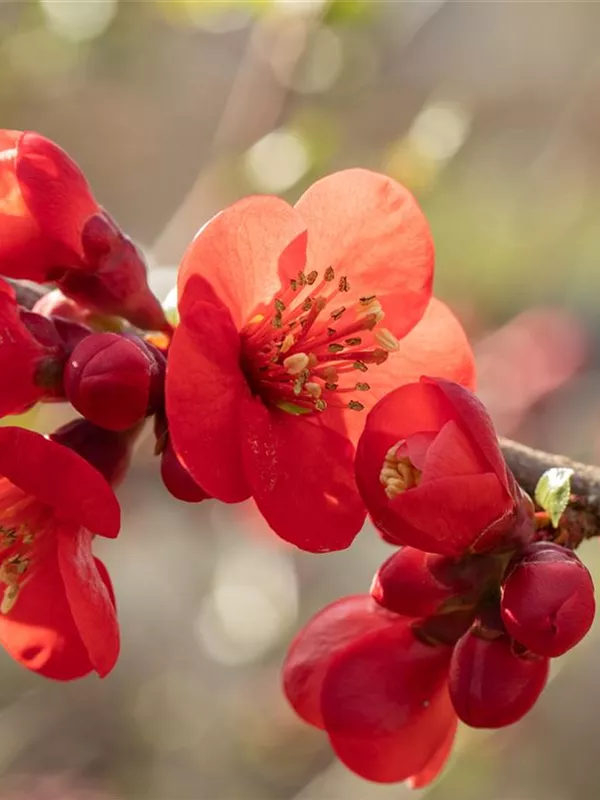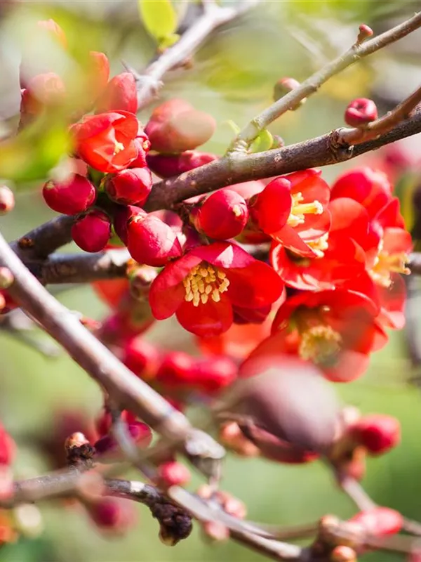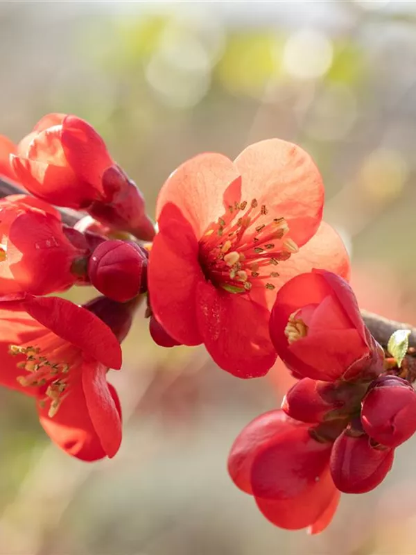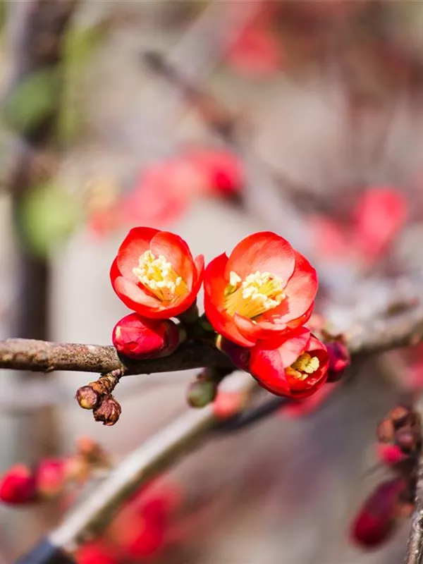 Die Niedrige Scheinquitte (Chaenomeles japonica) ist ein ausladender Kleinstrauch mit dekorativen, gelben, orangefarbenen, birnenförmigen Früchten. Diese verströmen einen angenehmen Duft. Die Blüten erscheinen je nach Sorte in verschiedenen Farben.