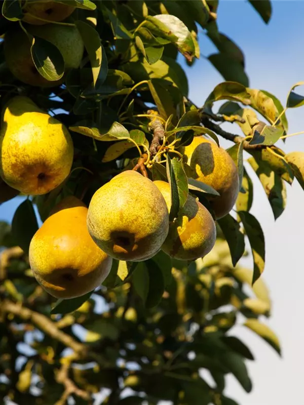 Die Birne 'Gellerts Butterbirne' (Pyrus communis) bildet gelbe, große, butterweich und saftige Früchte. Sie sind stumpfkegelförmig und haben einen würzigen Geschmack. Für eine ertragreiche Ernte ab September schaffen lockerer, lehmiger Boden und ein sonniger bis halbschattiger Standort optimale Bedingungen. Auch ihre weißen Blüten sind eine schöne Erscheinung.