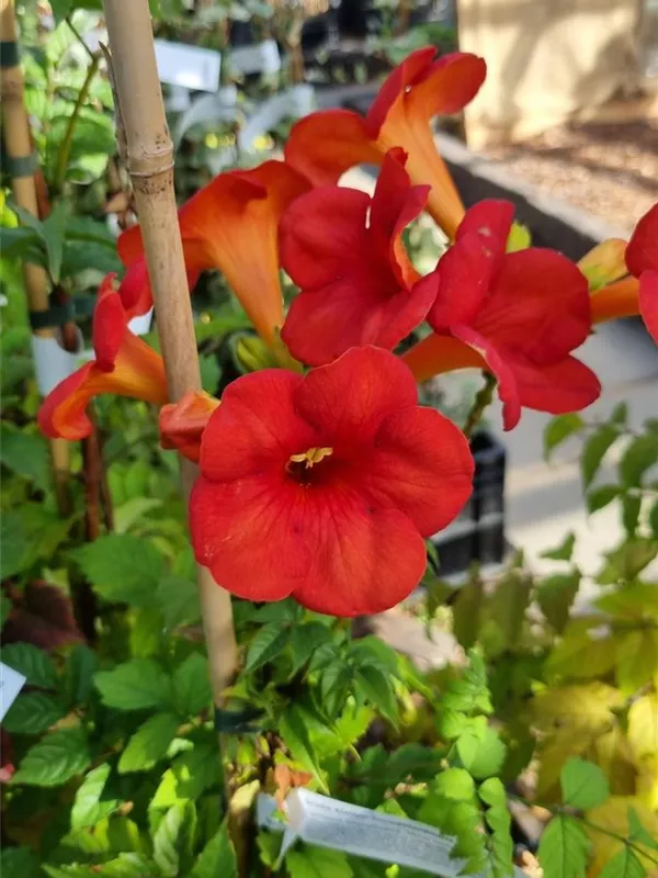 Die Große Kletter-Trompetenblume 'Mme Galen' (Campsis x tagliabuana) ist ein kletternder Strauch, der orange-rote Blüten hervorbringt. Sie erscheinen von Juli bis September. An einem sonnigen bis halbschattigen Standort mit durchlässigem, humosem Boden erreicht sie gewöhnlich eine Höhe von ca. 6 m und wird ca. 4 m breit.