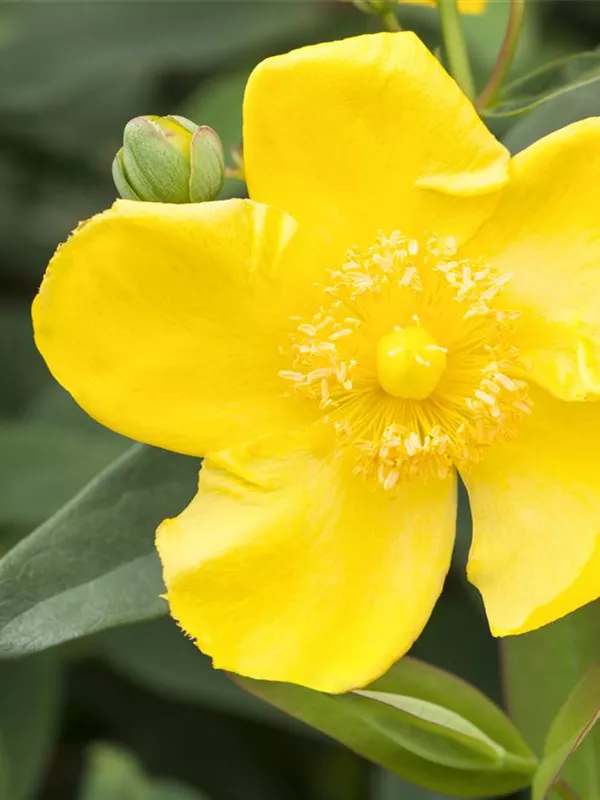 Das Großblumige Johanniskraut 'Hidcote' (Hypericum patulum) ist ein rundlicher Kleinstrauch, der goldgelbe, schalenförmige Blüten hervorbringt. Sie erscheinen von Juli bis Oktober. An einem sonnigen bis halbschattigen Standort mit durchlässigem, nährstoffreichem Boden erreicht es gewöhnlich eine Höhe von ca. 1,5 m und wird ca. 1 m breit.