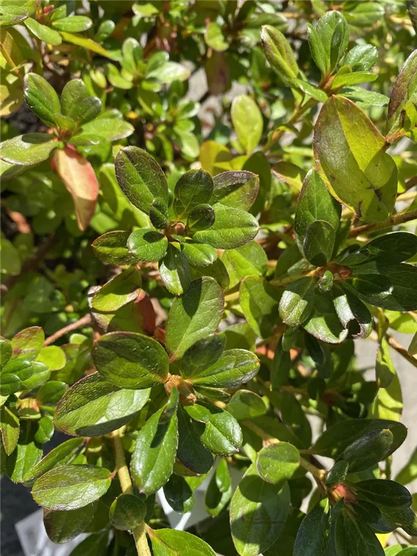 Die Japanische Azalee 'Vuyk´s Scarlet' ist wintergrün und trägt dunkelgrüne, glänzende, lanzettliche, eiförmige Blätter.