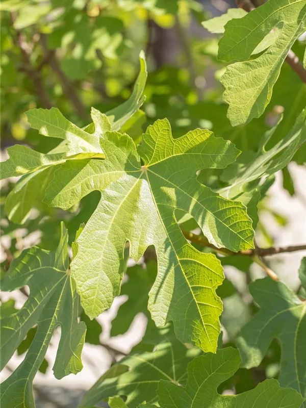 Die sommergrünen Blätter der Feige 'Osborn Prolific' sind dunkelgrün, glänzend, gelappt.