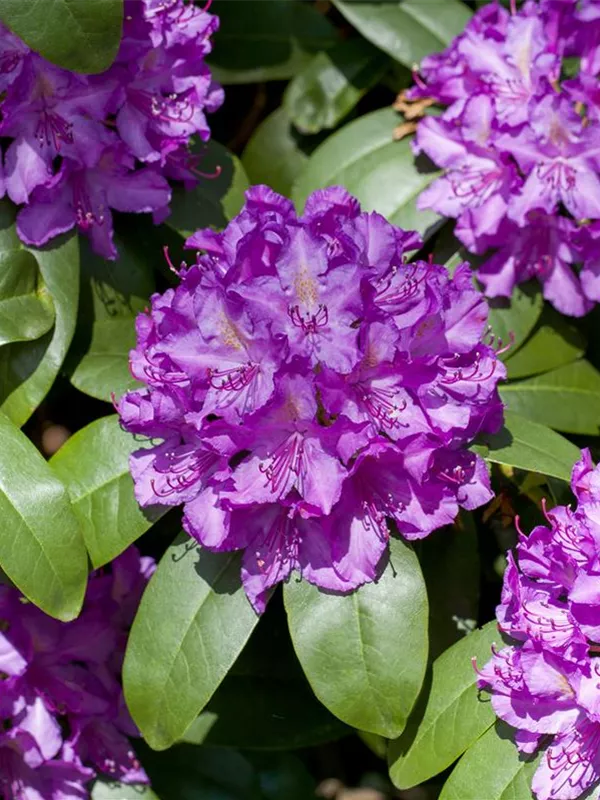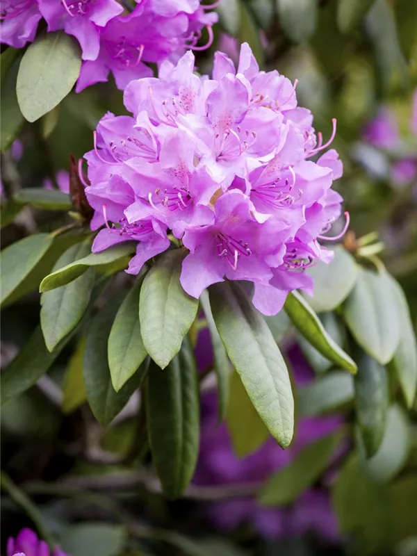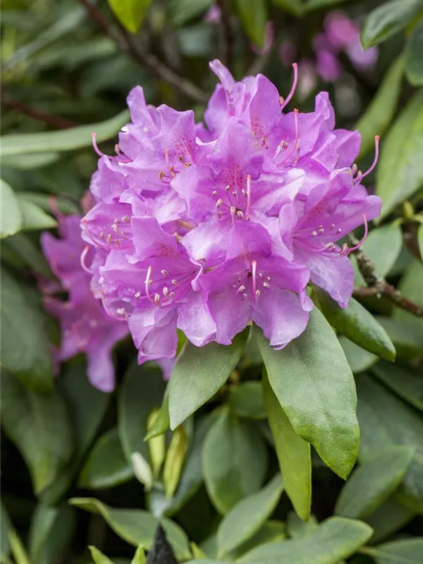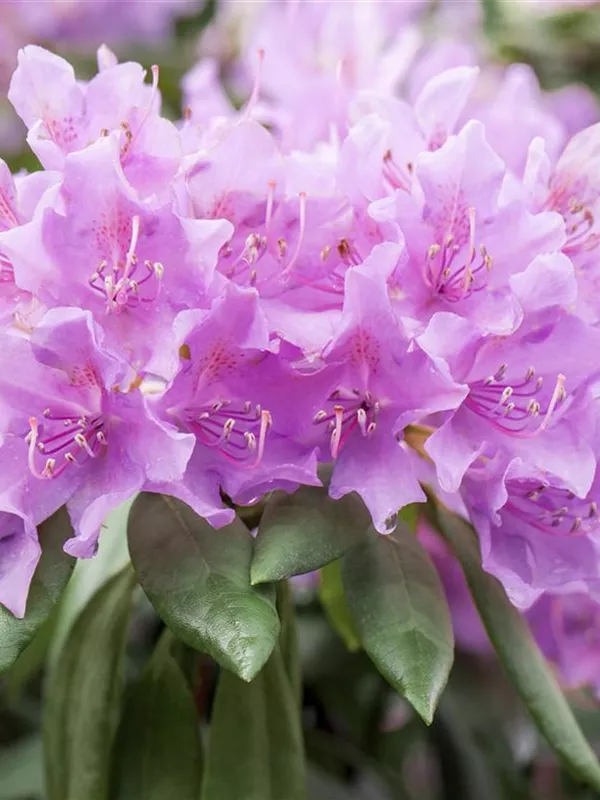 Rhododendron catawbiense 'Grandiflorum' bildet von Anfang Juni bis Ende Juni zahlreiche lilafarbene Blüten mit gelbroter Zeichnung.