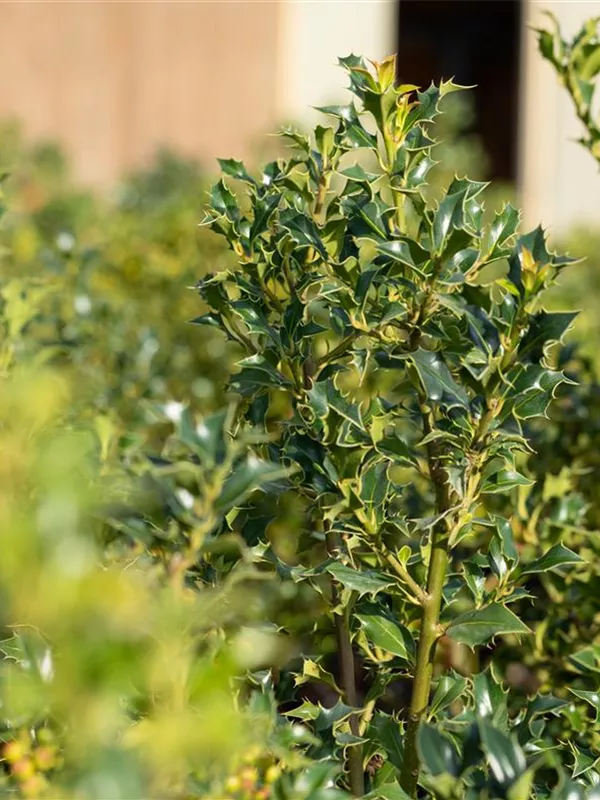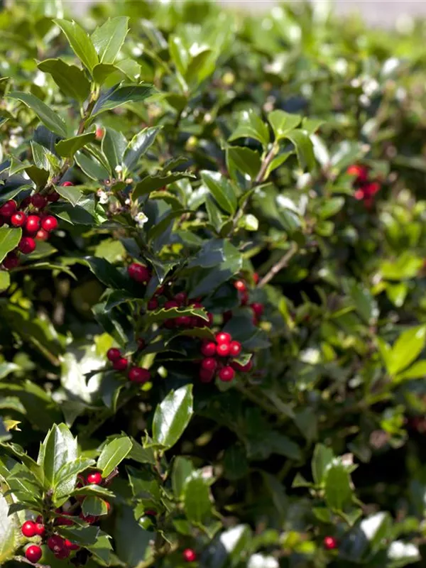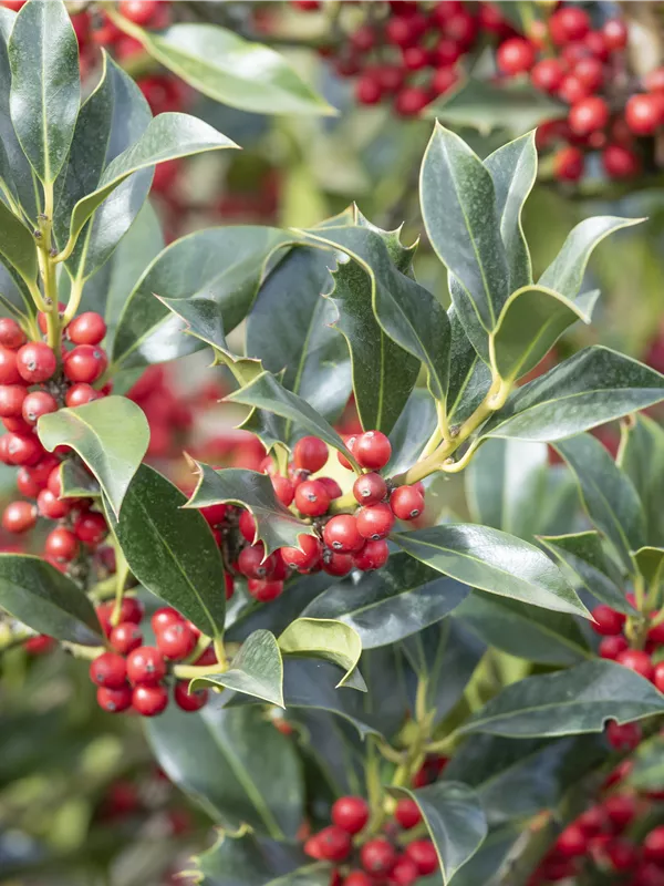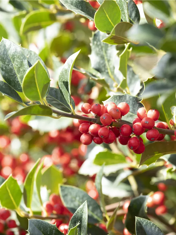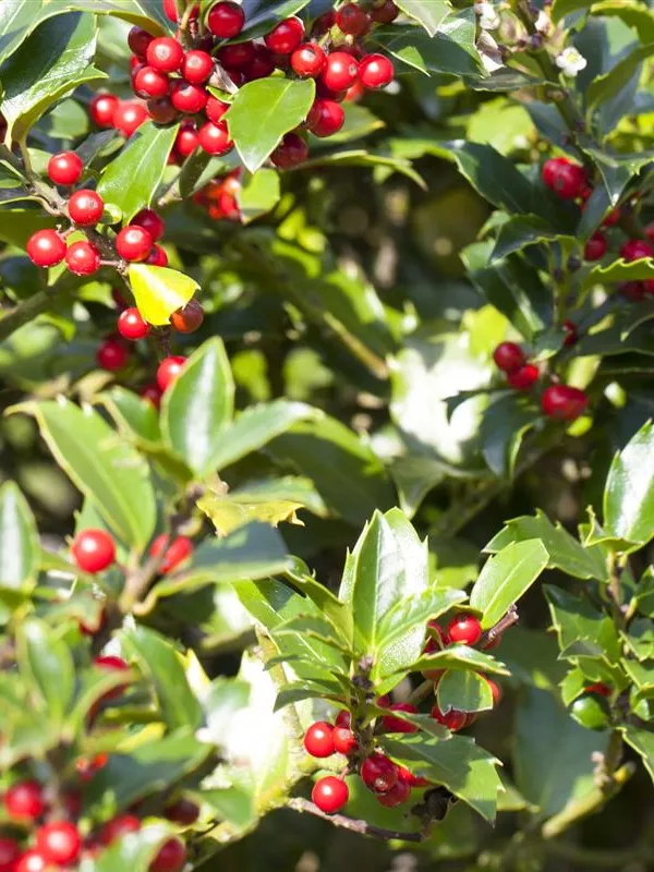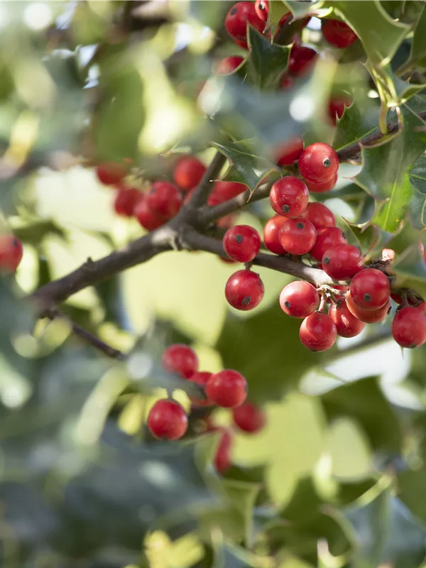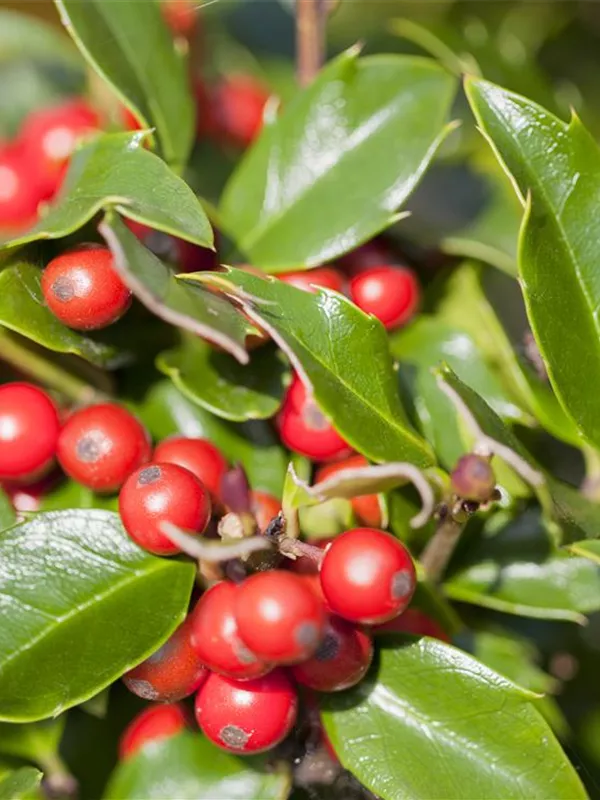 Besonders dekorativ sind die roten, runden Steinfrüchte von Ilex aquifolium 'Alaska'. Diese erscheinen ab Oktober und sind klein.Haften sehr lange.