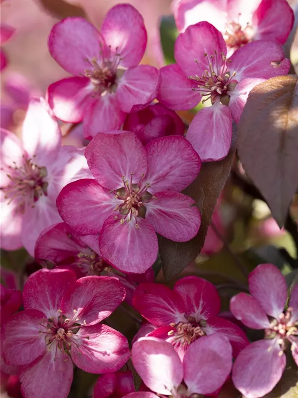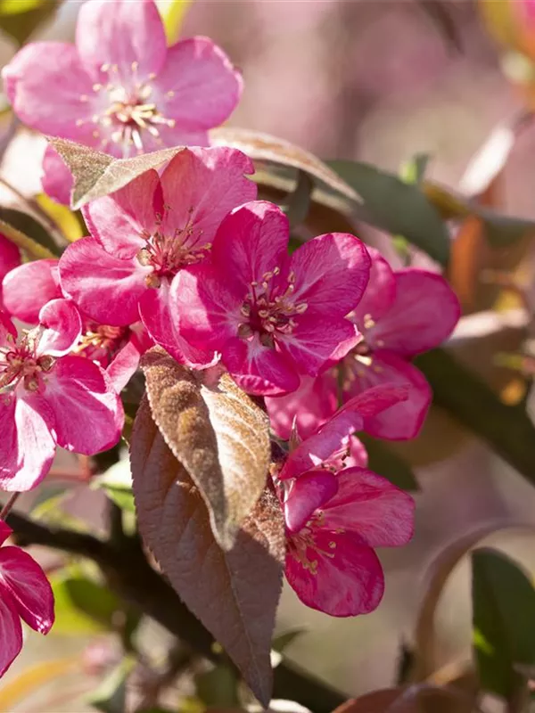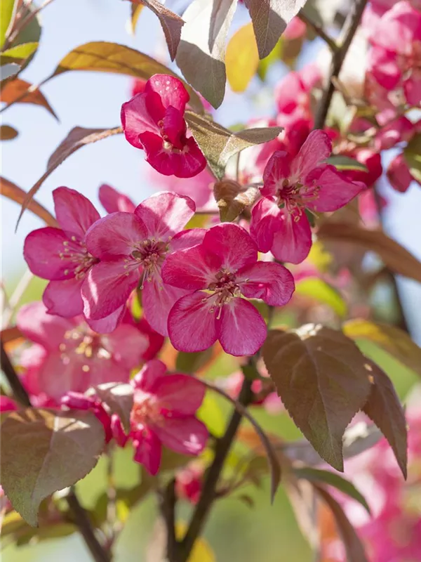 Der Zierapfel 'Coccinella'® (Malus) ist ein kegelförmiger, Großstrauch mit dekorativen sommergrünen, eiförmigen, purpurroten Blättern.