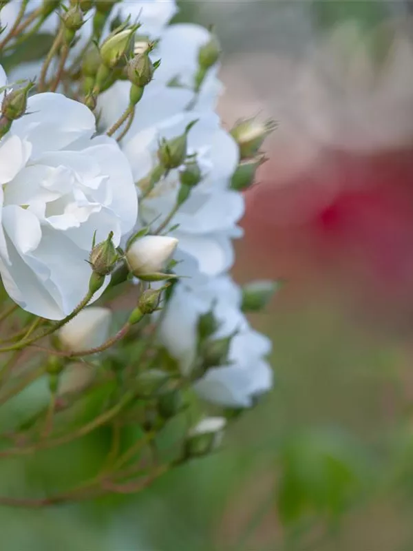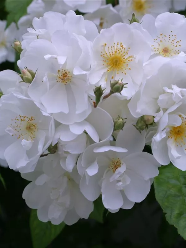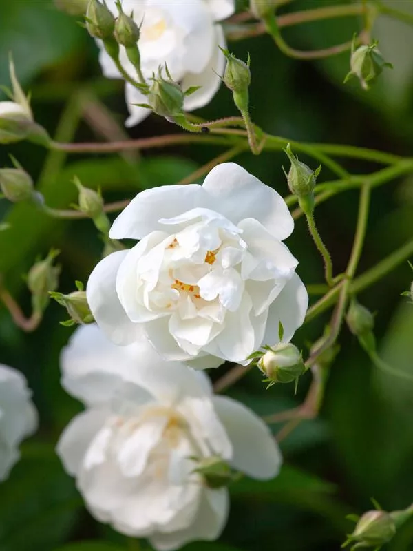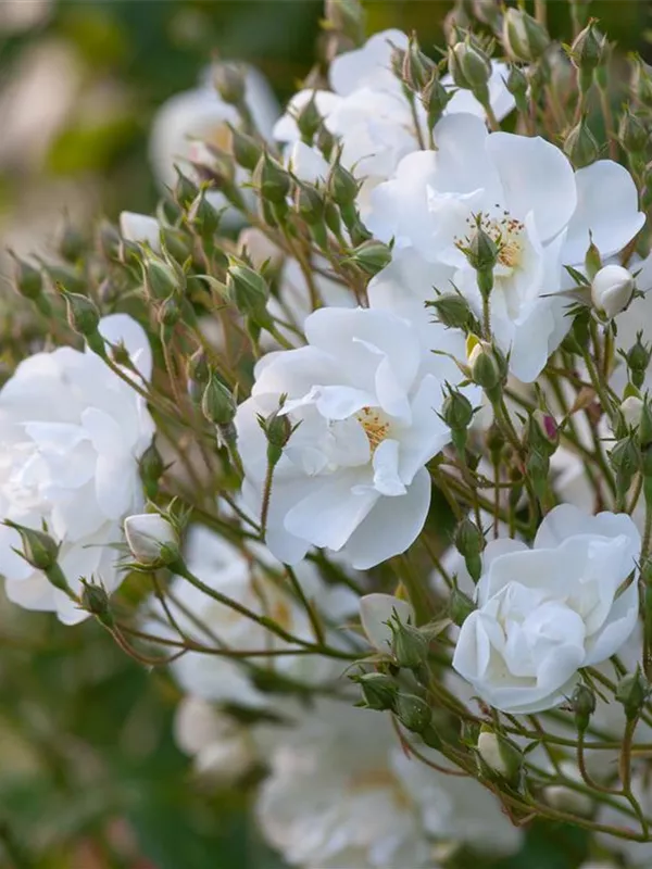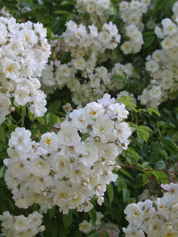 Die Kletterrose 'Bobby James' (Rosa) ist eine reichblühende Rose, die im Garten eine besondere Rolle spielt. Die zahlreichen Blüten sind weiß und erscheinen von Juni bis Juli. Ihr wunderbarer Duft entfaltet sich besonders an sonnigen, warmen Tagen. Mit den richtigen Begleitern an ihrer Seite, kommt die Königin der Blumen besonders gut zur Geltung. Niedrige Stauden, Lavendel und Salbei eignen sich ganz gut für diese Zwecke.