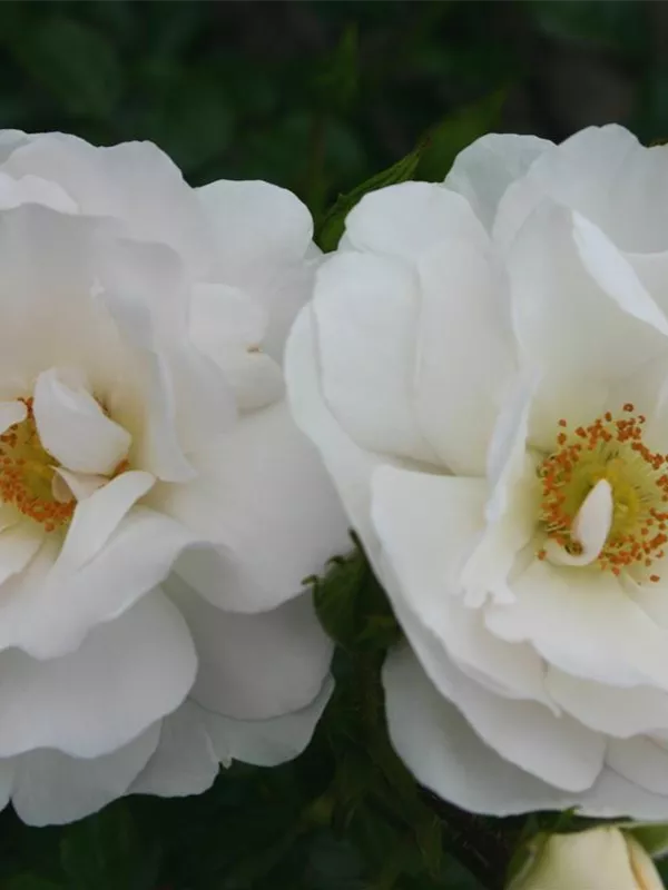 Die weißen, schalenförmigen Blüten sind halbgefüllt und erscheinen von Juni bis Oktober. Diese werden etwa 8 - 9 cm groß und sind leicht duftend.