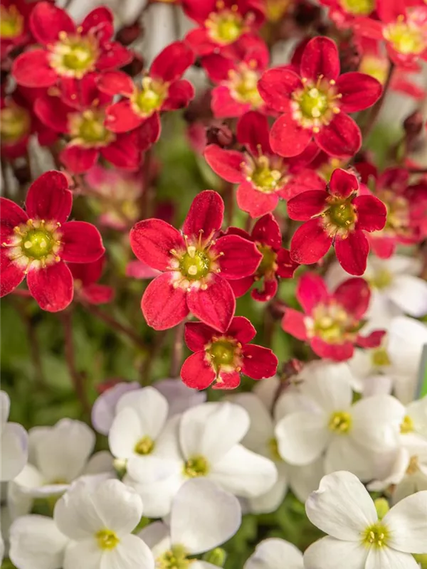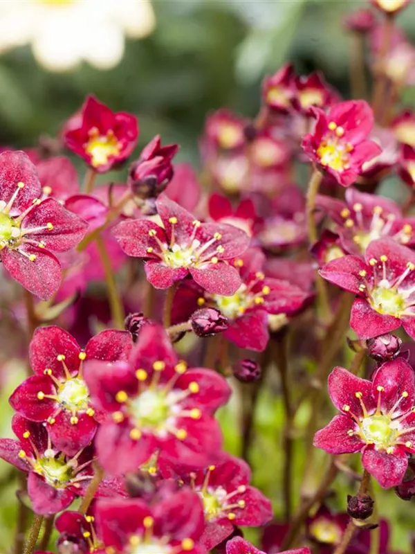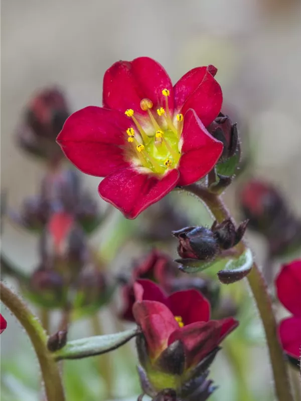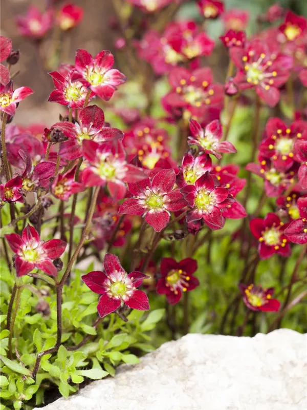 Saxifraga x arendsii, rot bildet schalenförmige, rote Blüten ab April.