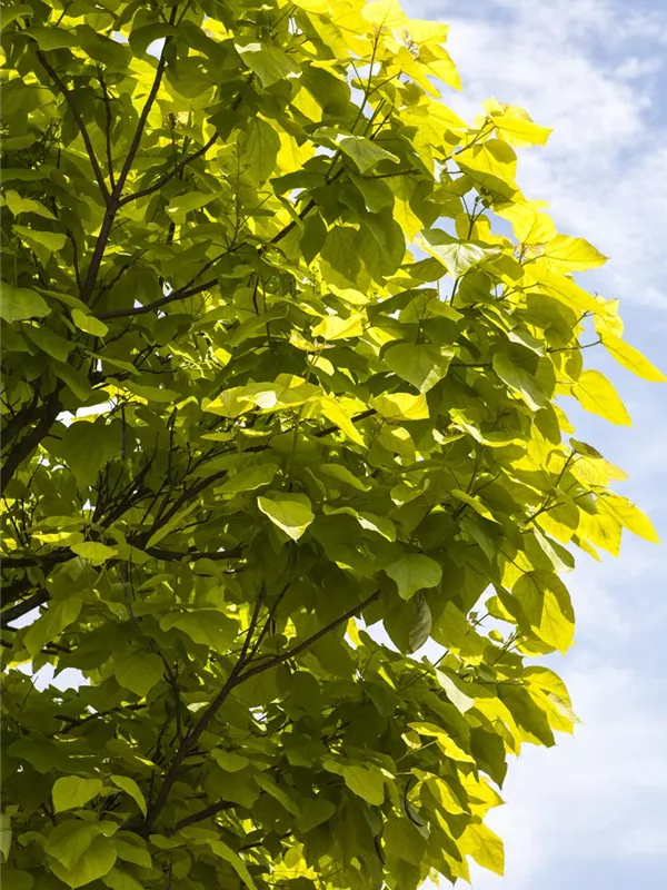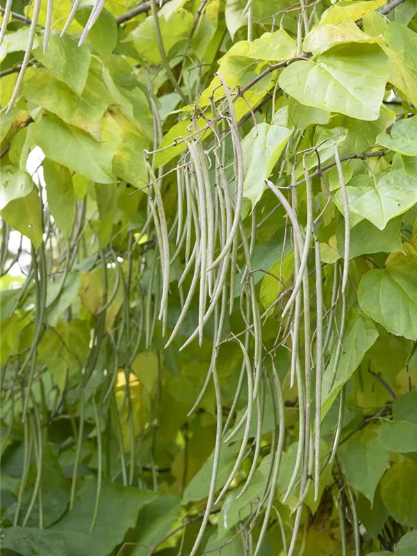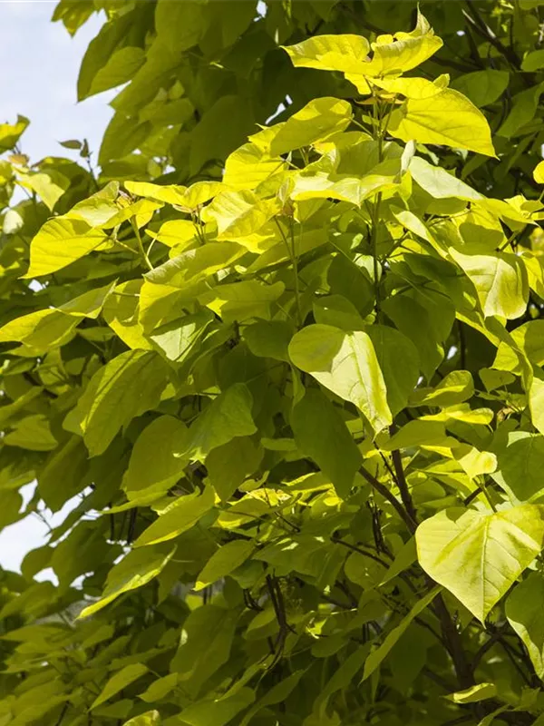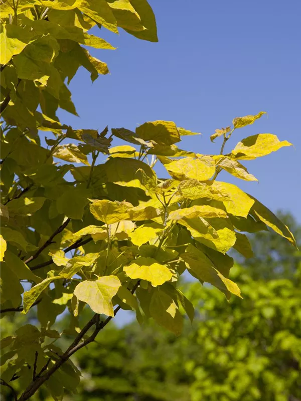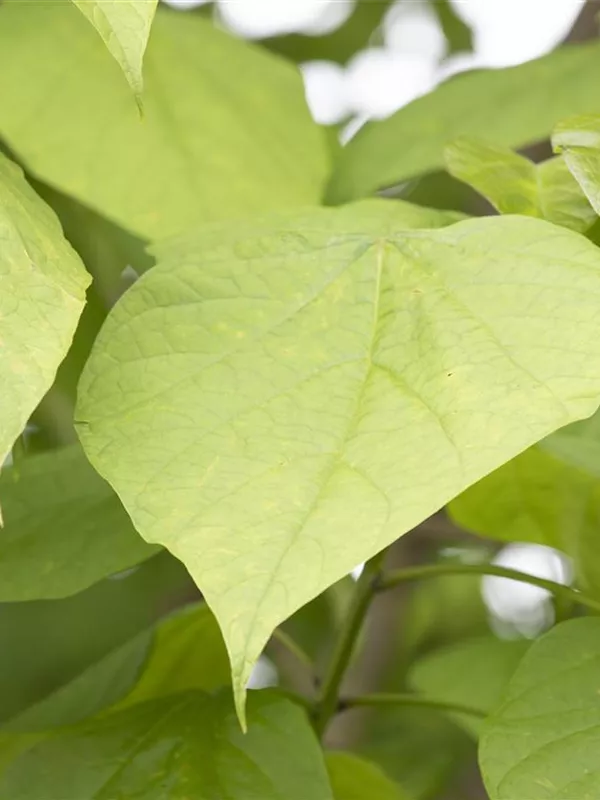 Die sommergrünen Blätter des Trompetenbaums sind mittelgrün, herzförmig, gegenständig. Diese sind etwa 10 - 20 cm groß. Trompetenbaum zeigt sich leuchtend gelb im Herbst.