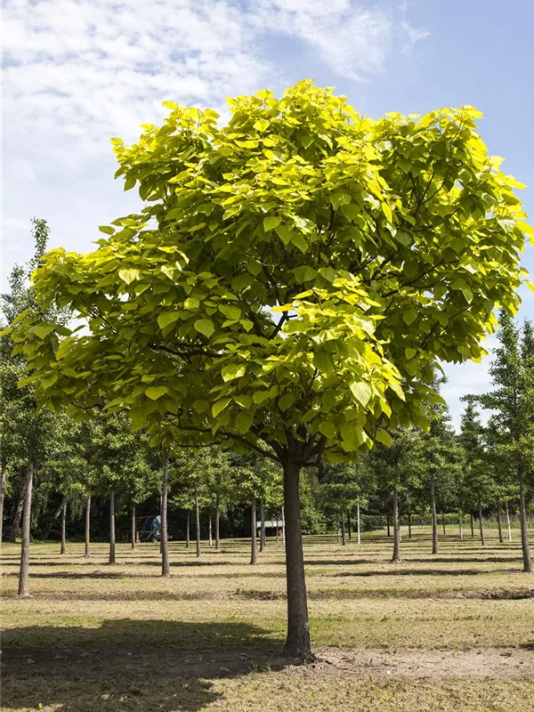 Der Trompetenbaum (Catalpa bignonioides) ein rundlicher Baum, der, je nach Sorte, Blüten in verschiedenen Farben hervorbringt. Seine Rinde ist dunkelgrau, längsgefurcht.