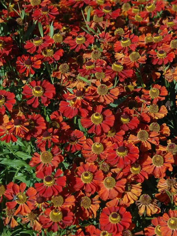 Die Garten-Sonnenbraut 'Moerheim Beauty' (Helenium) ist eine lockere, aufrechte Staude, die von Juli bis August bronzefarbene, körbchenartige Blüten bildet. An einem sonnigen Standort mit durchlässigem, nährstoffreichem Boden erreicht sie gewöhnlich eine Höhe von ca. 90 cm und wird ca. 50 cm breit. Die Garten-Sonnenbraut 'Moerheim Beauty' ist gut frostverträglich.