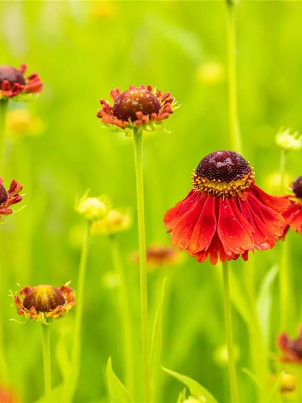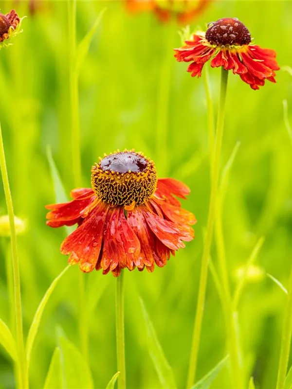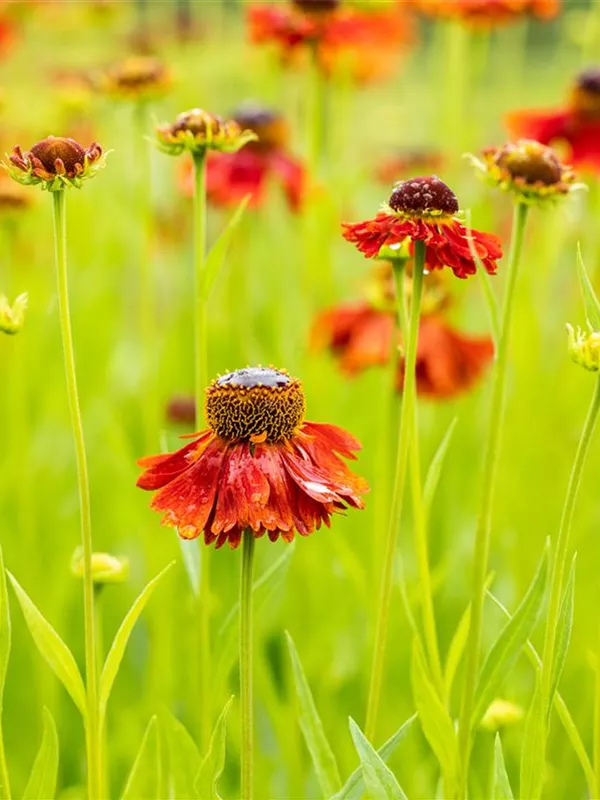 Helenium 'Moerheim Beauty' bildet körbchenartige, bronzefarbene Blüten ab Juli.