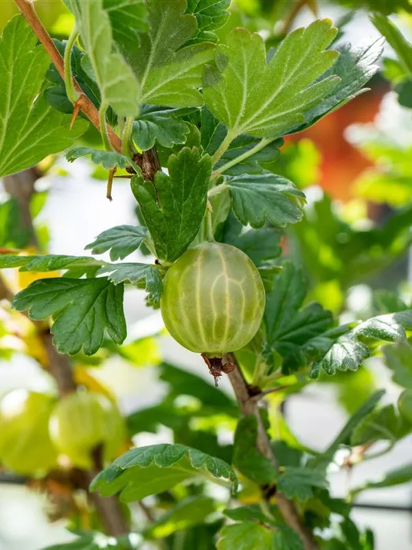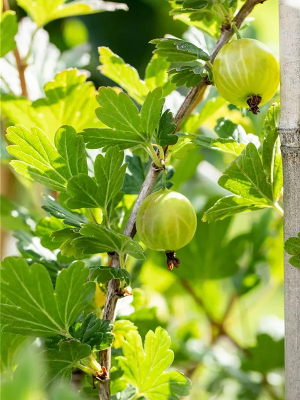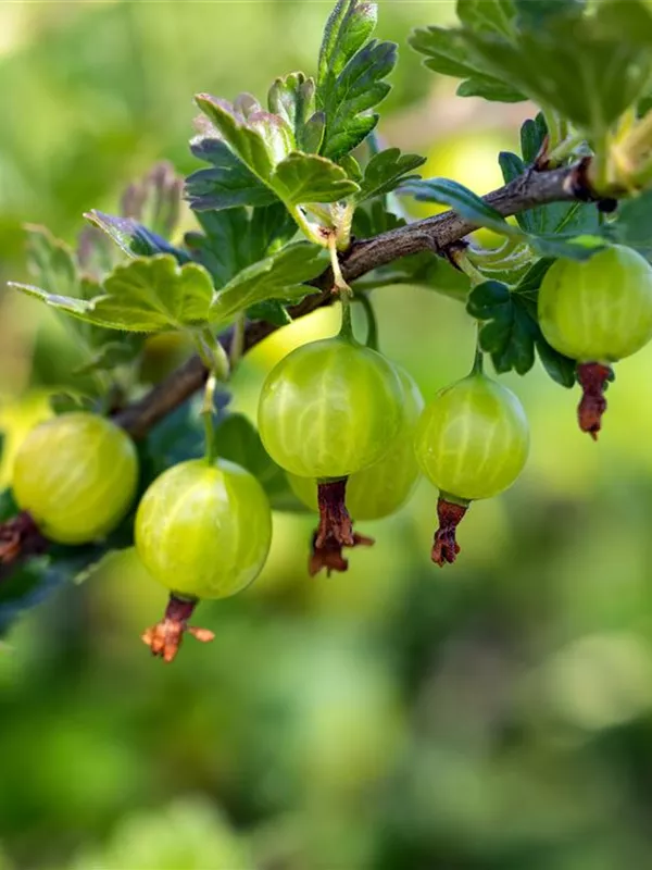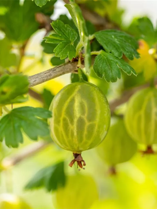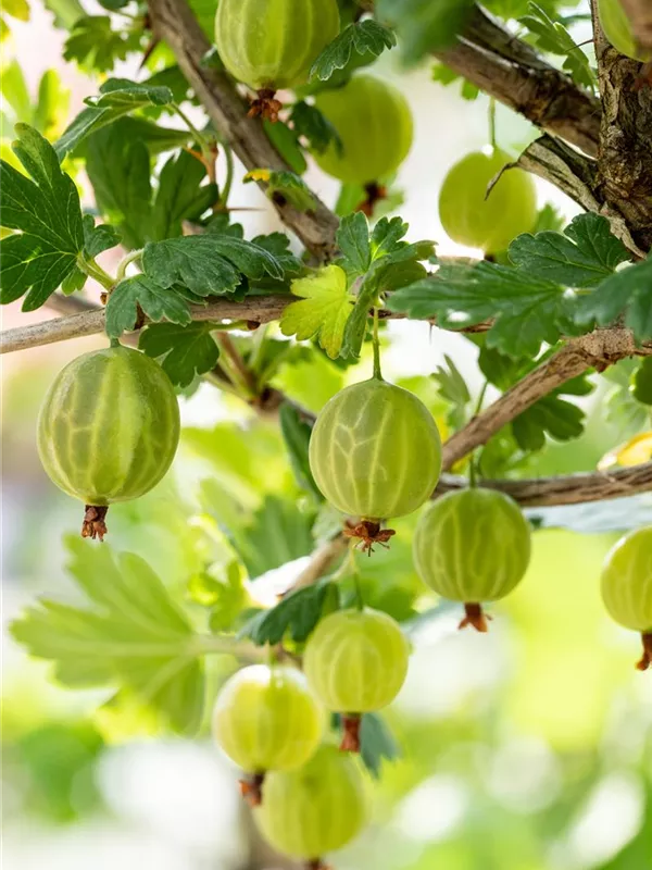 Die Stachelbeere 'Mucurines' (Ribes uva-crispa) bildet hellgrüne, große Beeren. Diese sind fest und süß im Geschmack. Für eine ertragreiche Ernte ab Juli schaffen durchlässiger, lockerer, nährstoffreicher Boden und ein sonniger bis halbschattiger Standort optimale Bedingungen. Auch ihre weißen Blüten sind eine schöne Erscheinung.