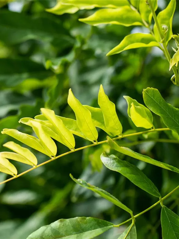 Die sommergrünen Blätter des Edelblauregens 'Macrobotrys' sind mittelgrün, gefiedert, wechselständig. Edelblauregen 'Macrobotrys' zeigt sich leuchtend gelb im Herbst.
