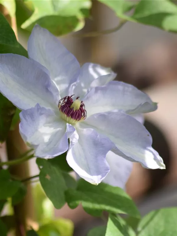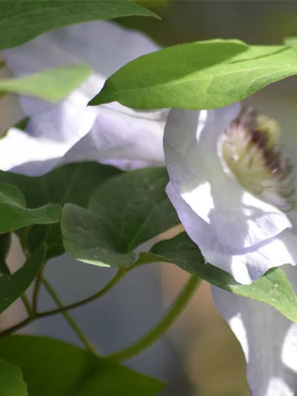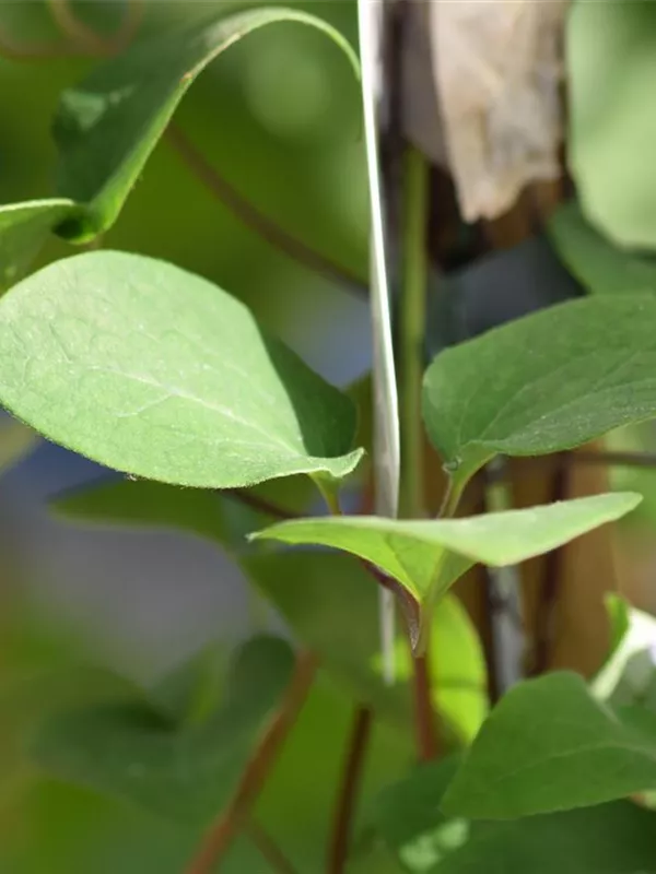 Die sommergrünen Blätter der Waldrebe 'Snow Queen' sind mittelgrün, gefiedert.