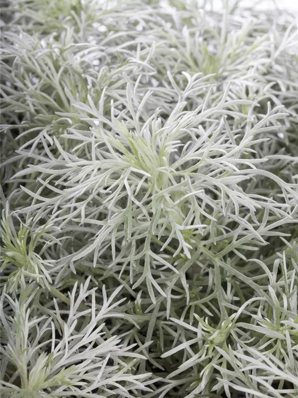 Hoher Blattschmuckwert. Die sommergrünen Blätter des Zwergiger Garten-Beifußes 'Nana' sind silbrig, lanzettlich.