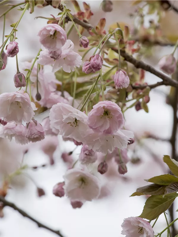 Die Japanische Nelkenkirsche 'Shirofugen' (Prunus serrulata) ist ein ausladender, trichterförmiger, malerischer Großstrauch mit dekorativen Früchten. Die weißen, schalenförmigen Blüten erscheinen von Mai bis Juni. Auch der kupferorange Austrieb ist sehr schön.