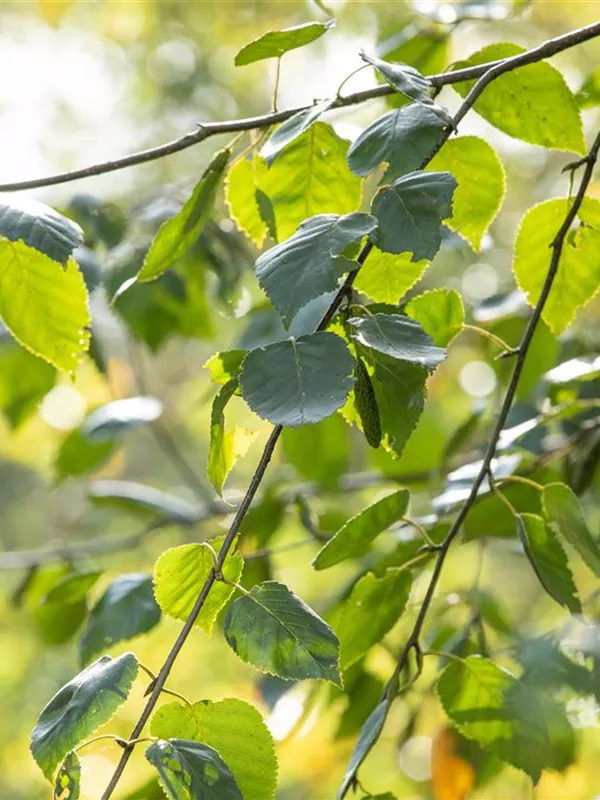 Die sommergrünen Blätter der Himalayabirke 'Doorenbos' sind mittelgrün, herzförmig, wechselständig. Diese sind etwa 5 - 7 cm groß. Himalayabirke 'Doorenbos' zeigt sich leuchtend goldgelb im Herbst.