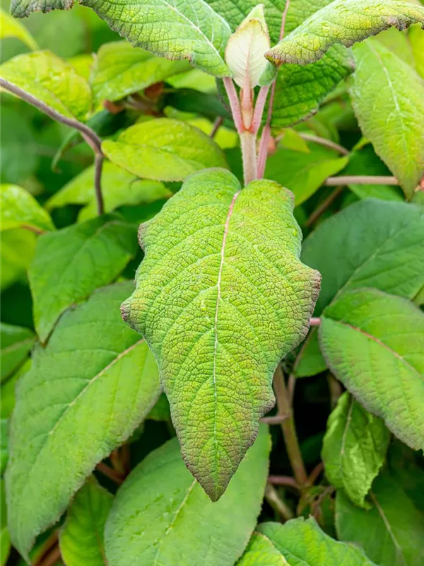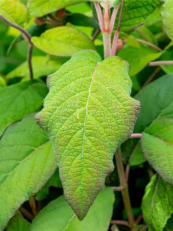 Die sommergrünen Blätter der Fellhortensie 'Macrophylla' sind dunkelgrün, lanzettlich, behaart, gegenständig. Diese sind etwa 20 - 35 cm groß.