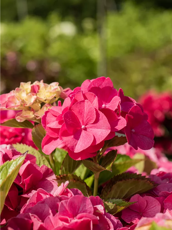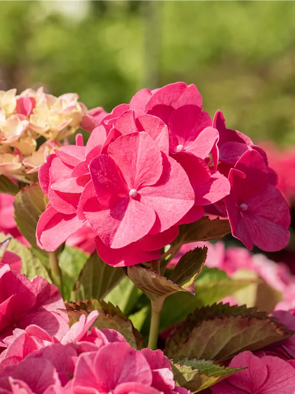 Die dunkelrosafarbenen, schalenförmigen Blüten der Bauernhortensie 'Sibilla' erscheinen in Dolden von Juni bis September.
