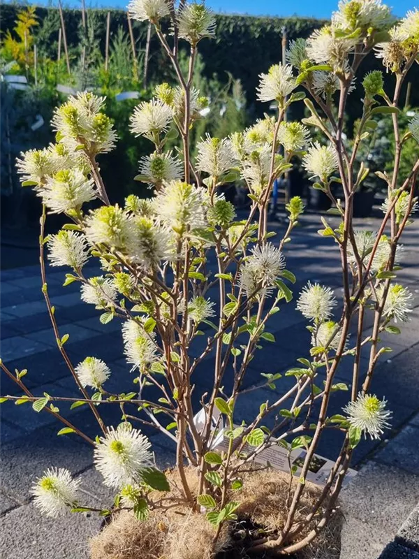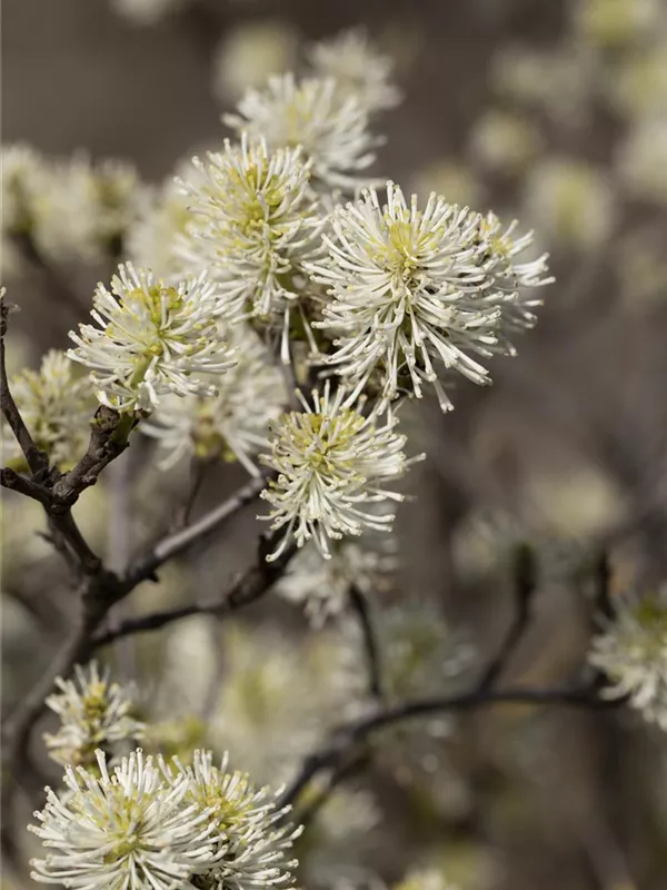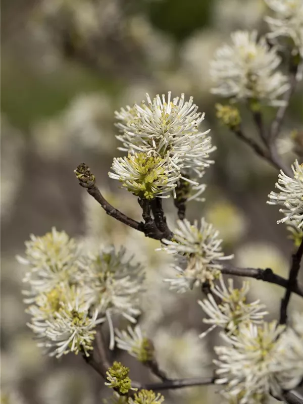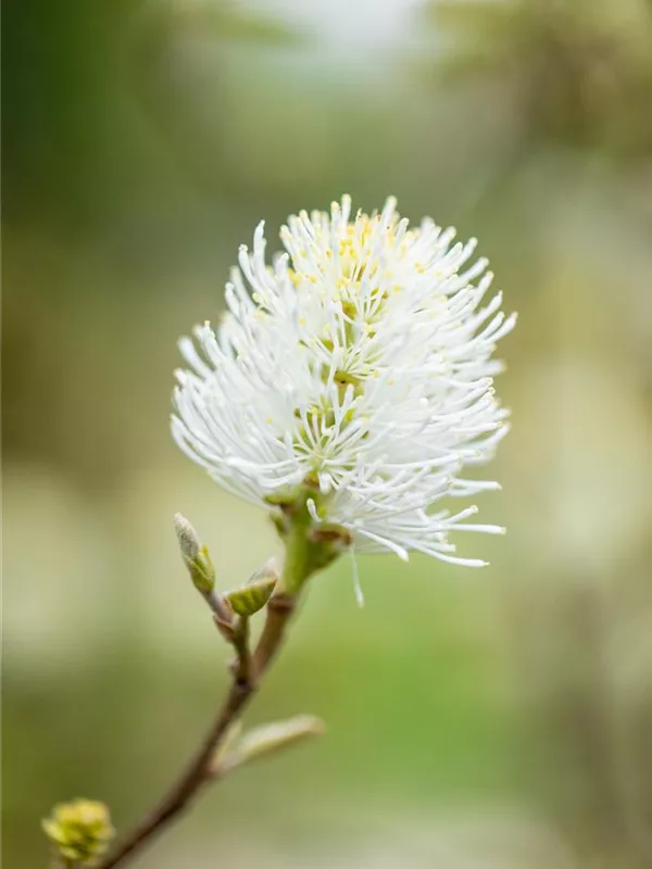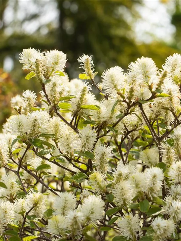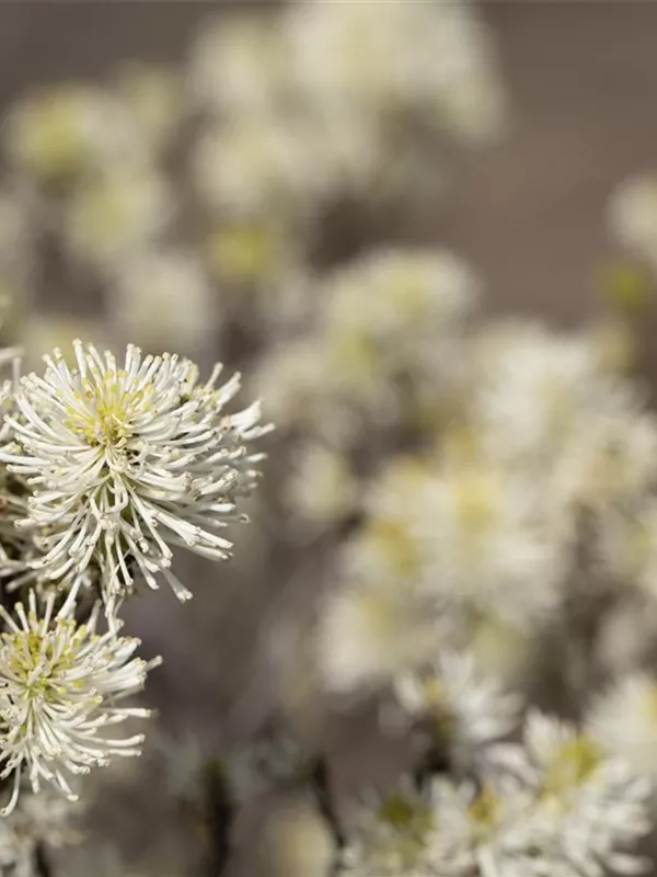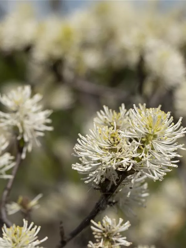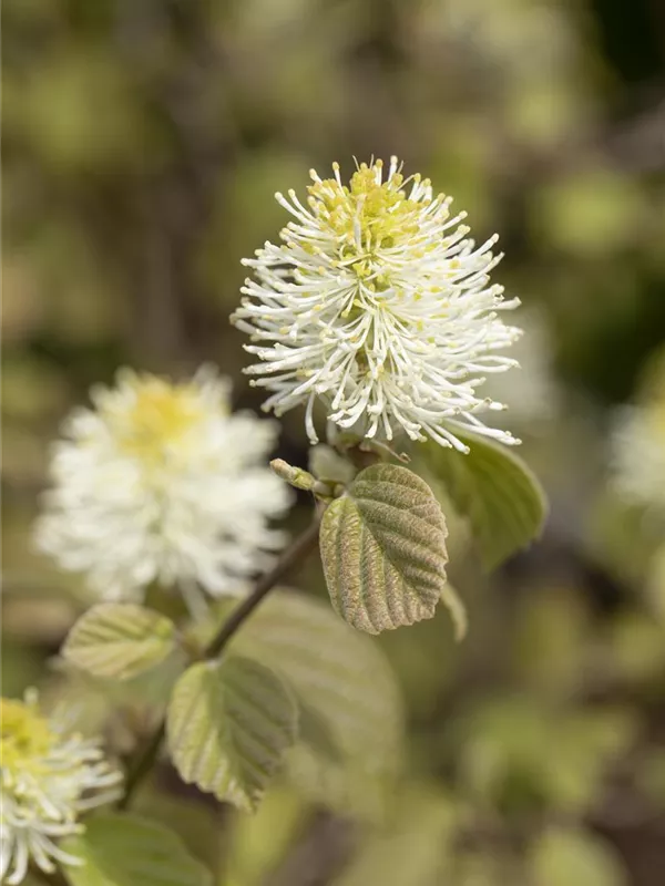 Der Große Federbuschstrauch (Fothergilla major) ein buschiger, aufrechter Strauch, der, je nach Sorte, Blüten in verschiedenen Farben hervorbringt. An einem sonnigen bis halbschattigen, windgeschützten Standort mit humosem, sandigem, saurem Boden erreicht er gewöhnlich eine Höhe von ca. 3 m und wird ca. 2 m breit.
