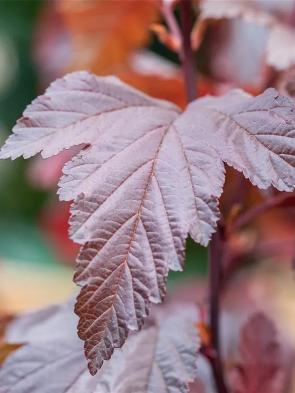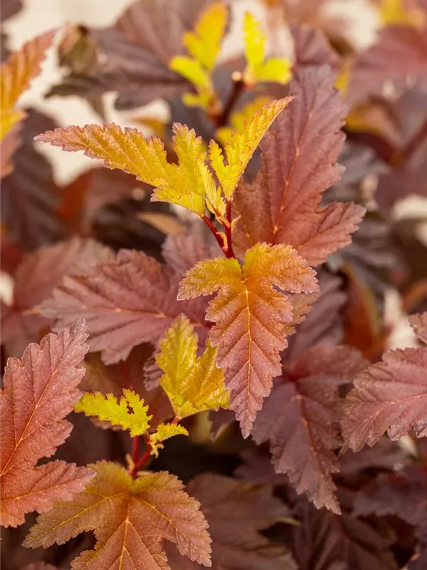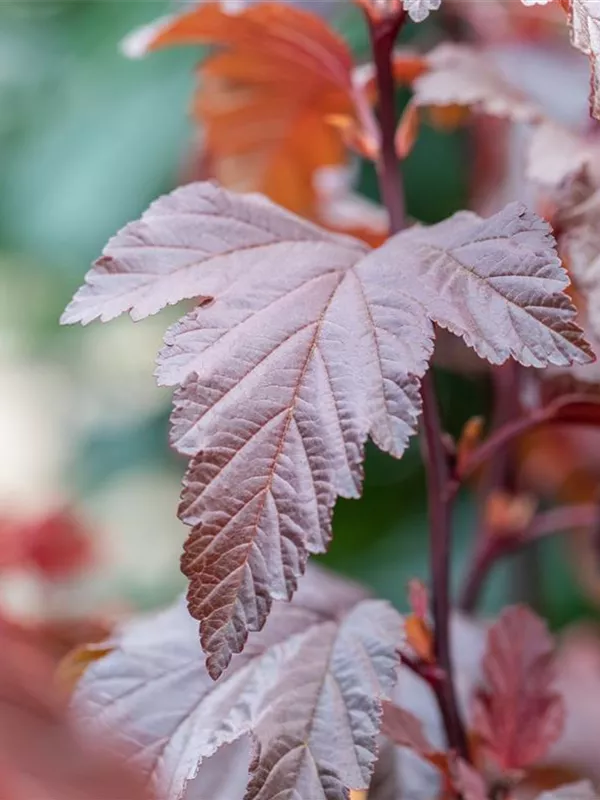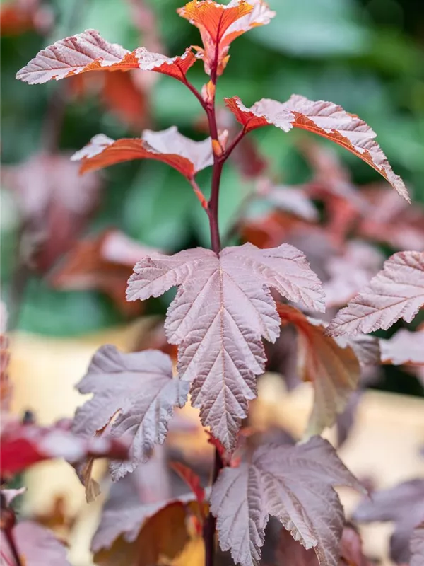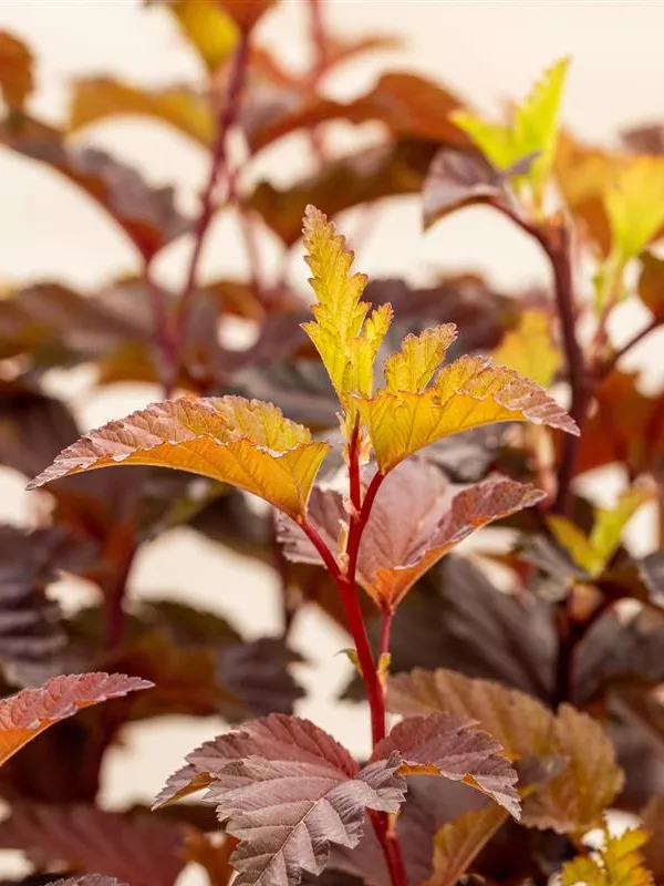 Hoher Blattschmuckwert. Die sommergrünen Blätter der Fasanenspiere 'Little Angel'® sind rot, eiförmig, wechselständig, gelappt. Diese sind etwa 5 - 10 cm groß.