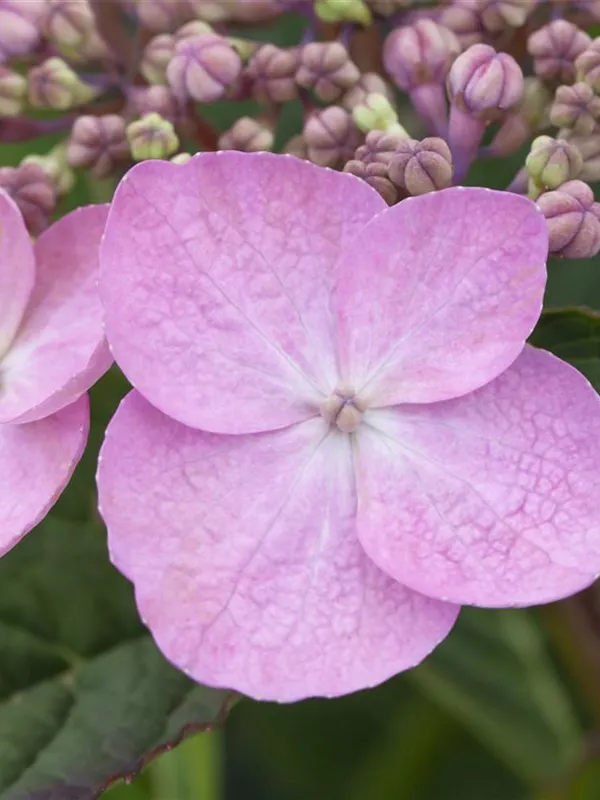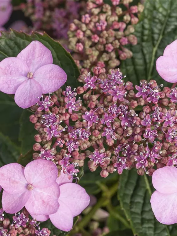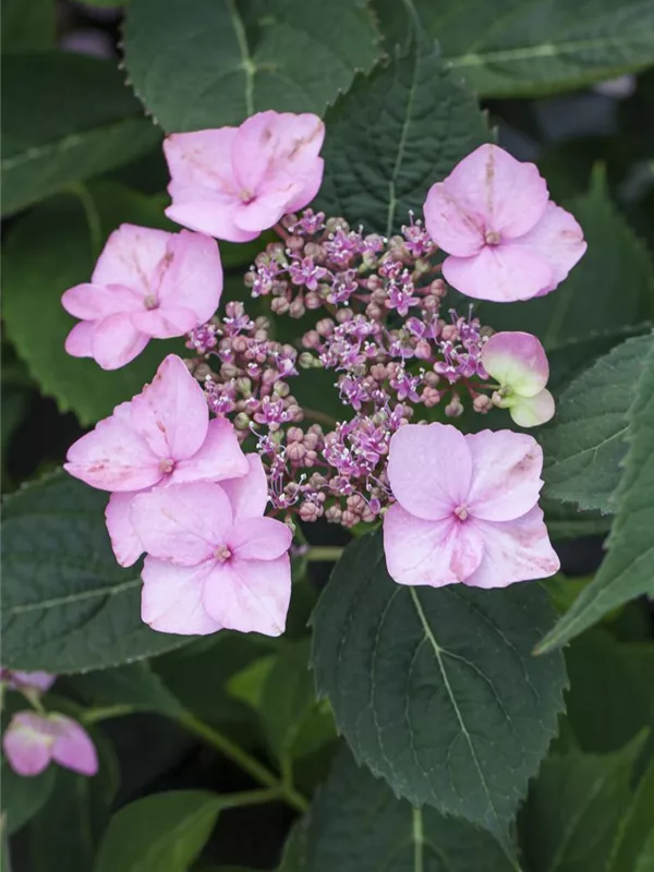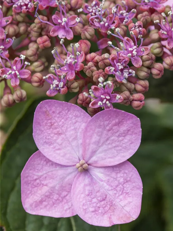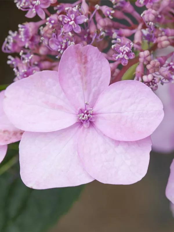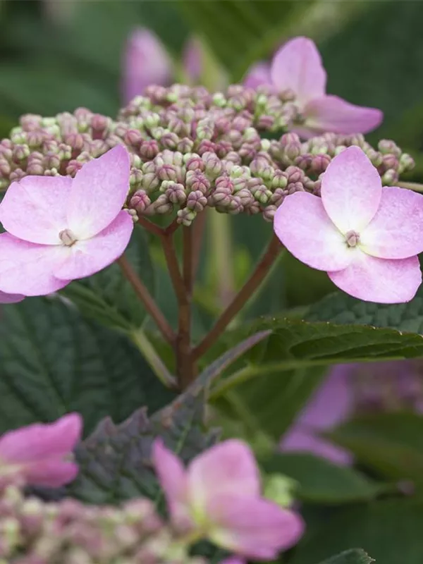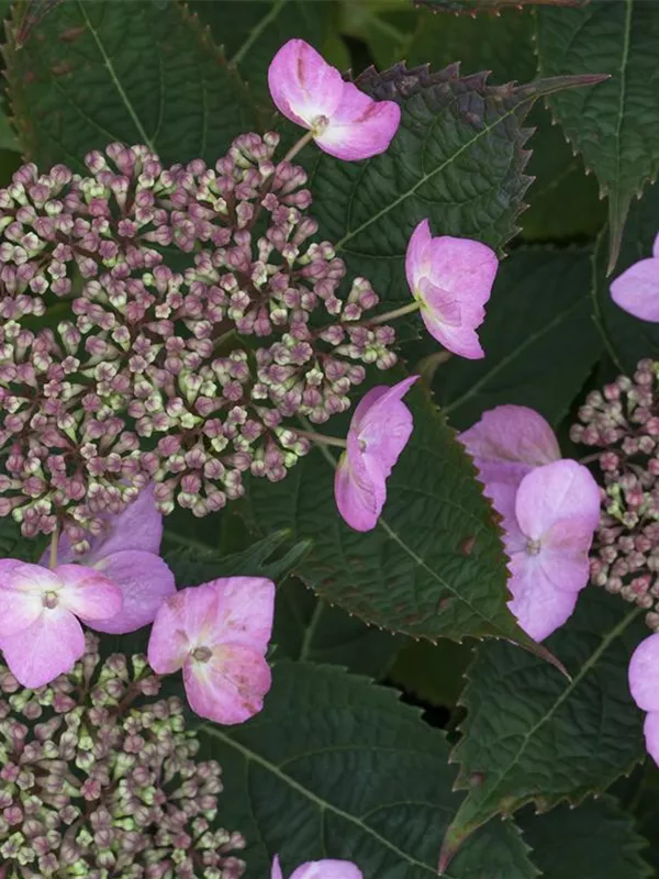Hydrangea serrata 'Koreana' bringt von Juli bis August rosafarbene, blaue Blüten hervor.