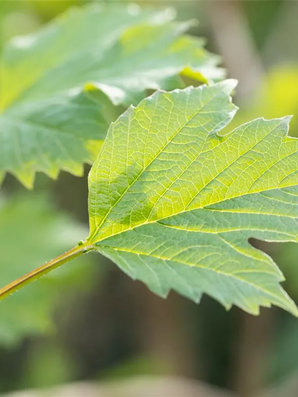 Die sommergrünen Blätter des Gemeinen Schneeballs sind hellgrün, rundlich, gegenständig, gelappt. Diese sind etwa 8 - 12 cm groß. Gemeiner Schneeball zeigt sich leuchtend orange-rot bis bordeauxrot im Herbst.