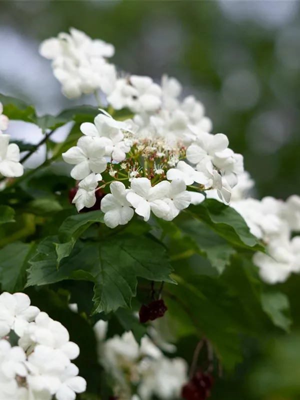 Der Gemeine Schneeball (Viburnum opulus) ist ein ausladender, lockerer Großstrauch mit dekorativen, roten Früchten, die sehr lange haften. Diesen voraus bringt er von Mai bis Juni weiße, in Schirmtrauben angeordnete Blüten hervor. Zudem trägt der Gemeine Schneeball, rundliche, hellgrüne Blätter. An einem sonnigen bis halbschattigen Standort mit kalkhaltigem, nährstoffreichem, feuchtem bis nassem Boden erreicht er gewöhnlich eine Höhe von ca. 5 m und wird ca. 4 m breit.