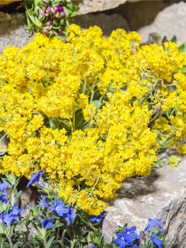 Aurinia saxatilis 'Summit' bildet radförmige, gelbe Blüten ab April.