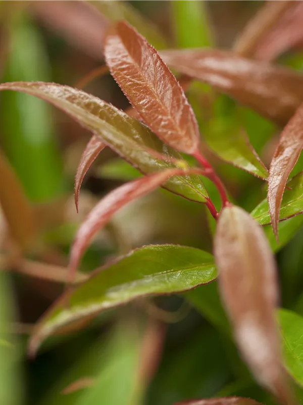 Die immergrünen Blätter der Traubenmyrthe 'Burning Love' sind dunkelgrün, lanzettlich, glänzend, gezähnt. Roter Austrieb. Mit seinem karminroten Laub setzt sie schöne Akzente im Winter.