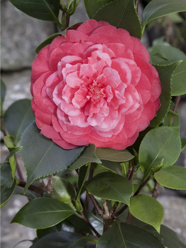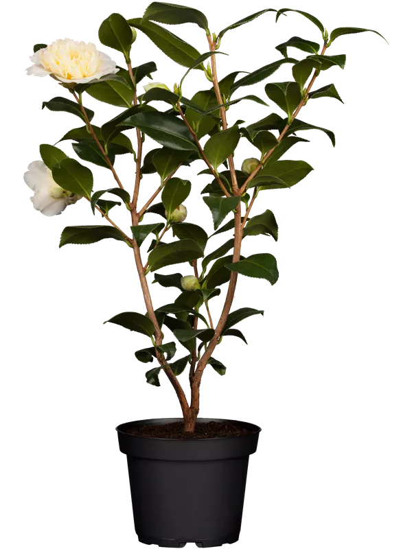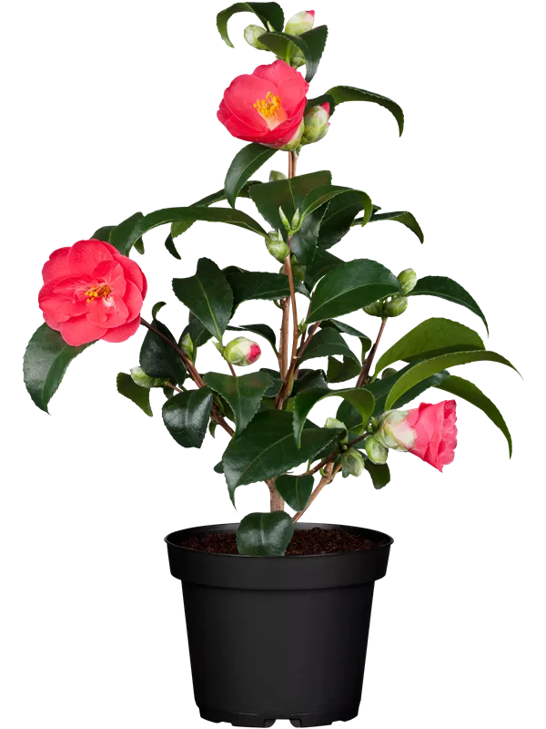 Die Japanische Kamelie (Camellia japonica) ist eine sehr beliebte, immergrüne Kübelpflanze, deren braunen Früchte bei guter Pflege möglich sind. Ihre dekorativen Blüten erscheinen von Februar bis Mai. Die dunkelgrünen Blätter sind lanzettlich und glänzend, ledrig. Der Standort sollte möglichst sonnig bis halbschattig sein. Eine durchlässige, humose, sandige und lehmige Erde ist dabei ideal. Bei günstigen Bedingungen erreicht die Japanische Kamelie eine Höhe von ca. 3 m und wird bis zu 2 m breit.